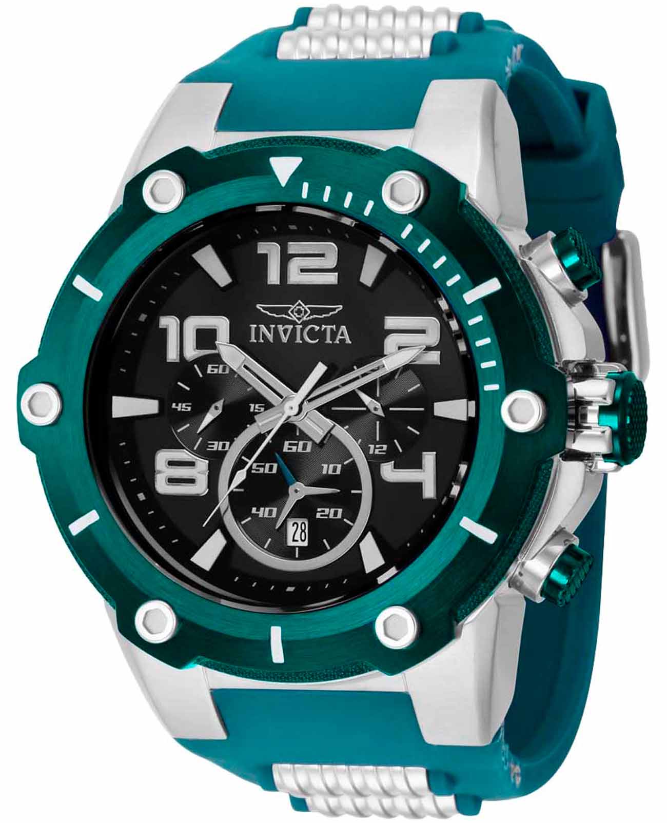 Мужские наручные часы-хронографХронографФункция позволяет измерять отрезки времени с особой точностью: часы, минуты, секунды. Верным признаком хронографа является наличие на циферблате 3 дополнительных окошек-счётчиков. Invicta IN40897 из коллекции Speedway сочетают в себе спортивный дизайн и надежность современных технологий. Модель обладает круглым корпусом, изготовленным из нержавеющей стали, что обеспечивает высокую устойчивость к внешним воздействиям . БезельБезельВнешний ободок, закрепляющий стекло. В спортивных часах так называется поворотное кольцо с делениями на циферблате, выполняет роль таймера – замеряет отрезки времени на шкале. Неподвижный безель – элемент декора. Однонаправленно вращающийся безель на дайверских часах позволяет фиксировать моменты погружения и выныривания на поверхность. с IP-покрытиемIP-покрытиеМетод ионного напыления. Демонстрирует повышенную устойчивость к истиранию, окислению и химическим веществам. Под воздействием высокого давления и температуры около 1500°C молекулы металла надёжно соединяются с частицами корпуса часов.. Ремешок оснащен классической застежкой, гарантирующей комфортное ношение и безопасность . Циферблат оснащен окном даты, расположенным в положении 6 часов, что делает их практичными для различных задач . Для защиты используется минеральное стеклоМинеральное стеклоМинеральное стекло представляет собой искусственно выращенный минерал кварца. Такое стекло отличается особой устойчивостью к повреждениям и царапинам. Уступает по некоторым качествам сапфировому стеклу., обеспечивающее прочную защиту от царапин . Часы работают на японском кварцевом механизме, что гарантирует точное время без необходимости подзаводки . Модель также является хронографомХронографФункция позволяет измерять отрезки времени с особой точностью: часы, минуты, секунды. Верным признаком хронографа является наличие на циферблате 3 дополнительных окошек-счётчиков., оснащенным функцией секундомераСекундомерСекундоме́р — прибор, способный измерять интервалы времени с точностью до долей секунды., что делает ее идеальной для активного образа жизни . Водонепроницаемость часов достигает 100 метров (10 атмосфер), что позволяет использовать их во время плавания и других водных видов спорта . Подсветка выполнена с использованием люминесцентного покрытияЛюминесцентное покрытиеПозволяет считывать показания времени в темноте. Производители наносят на стрелки, часовые индексы, безель или поверхность циферблата светонакопительный состав, дающий холодное свечение., что обеспечивает удобство использования в темное время суток .