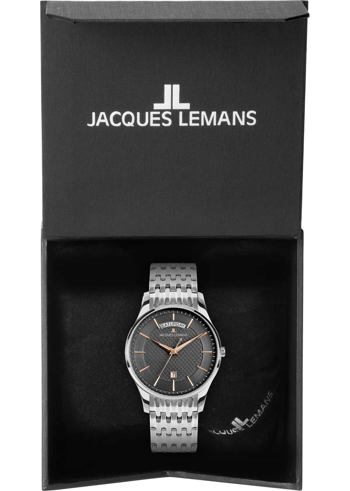 Мужские часы Jacques Lemans 1-2193I – лаконичная красота и изысканная элегантность. Корпус из нержавеющей стали диаметром 40 мм идеально сбалансирован и элегантен. Ударопрочное минеральное стеклоМинеральное стеклоМинеральное стекло представляет собой искусственно выращенный минерал кварца. Такое стекло отличается особой устойчивостью к повреждениям и царапинам. Уступает по некоторым качествам сапфировому стеклу. Crystex защищает циферблат от царапин. Стальной браслет на застёжке-бабочке с кнопкамиЗастёжка "бабочка"Такой вид застёжки дополняется предохранителями, помогающими избежать случайного раскрытия браслета. Обладают изящным исполнением. . Крупные накладные риски хорошо читаются благодаря PVD-покрытиюPVDУльтратонкое покрытие наносится в технике вакуумного напыления, сочетает в себе нитрид титана особой прочности со слоем золота или оксида хрома. Несёт в себе декоративную или защитную функцию. из розового золота. Водозащита 50 метров защищает часы от брызг и дождя, делая их подходящими для повседневного использования. Стрелки и метки с люминесцентным покрытиемЛюминесцентное покрытиеПозволяет считывать показания времени в темноте. Производители наносят на стрелки, часовые индексы, безель или поверхность циферблата светонакопительный состав, дающий холодное свечение. позволяющие легко определять время даже в темноте. Окошко даты находится в положении 6 часов. Широкое окошко дня недели в положении 12 часов позволяет показывать название дня недели полностью, без сокращений.