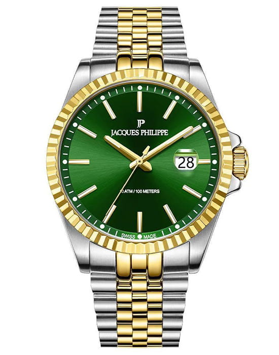 Jacques Philippe JPQGS5973X8V2 — мужские часы в сдержанном классическом исполнении с акцентом на простоту и надёжность. Корпус диаметром 40 мм выполнен из нержавеющей стали, а его умеренная толщина — около 12 мм — делает модель универсальной и комфортной в повседневной носке. БезельБезельВнешний ободок, закрепляющий стекло. В спортивных часах так называется поворотное кольцо с делениями на циферблате, выполняет роль таймера – замеряет отрезки времени на шкале. Неподвижный безель – элемент декора. Однонаправленно вращающийся безель на дайверских часах позволяет фиксировать моменты погружения и выныривания на поверхность. с PVD-покрытиемPVDУльтратонкое покрытие наносится в технике вакуумного напыления, сочетает в себе нитрид титана особой прочности со слоем золота или оксида хрома. Несёт в себе декоративную или защитную функцию.. Циферблат оформлен в светлом зеленом тоне с тонкими стрелками, лаконичными часовыми метками и аккуратным окошком даты в позиции «3 часа». Минималистичный стиль подчёркивает строгость и чистоту дизайна. Поверхность защищена устойчивым к царапинам сапфировым стекломСапфировое стеклоПрочный и надёжный материал из кристалла сапфира синтетического происхождения, характеризующийся особой твёрдостью и устойчивостью к царапинам и повреждениям., которое обеспечивает хорошую читаемость и долговечность. Механизм — точный швейцарский кварц, не требующий подзавода. Он обеспечивает стабильную и бесперебойную работу часов, сохраняя точность в любых условиях. Браслет из нержавеющей стали с PVD-покрытиемPVDУльтратонкое покрытие наносится в технике вакуумного напыления, сочетает в себе нитрид титана особой прочности со слоем золота или оксида хрома. Несёт в себе декоративную или защитную функцию. визуально продолжает корпус и фиксируется с помощью надёжной застёжки, обеспечивая комфортную посадку. Ширина браслета — 22 мм. Водозащита до 10 ATM позволяет использовать часы не только в повседневной жизни, но и при активности на воде. Jacques Philippe — это надёжная и универсальная модель для тех, кто ценит швейцарскую точность, простоту и уверенный стиль без лишних деталей.
