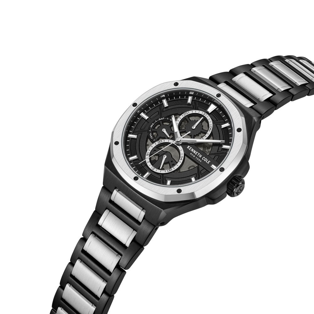 Мужские кварцевые часы Kenneth Cole KCWGK0047203 из коллекции Dress Sport — это стильный и функциональный аксессуар с современным дизайном. Корпус размером 43 мм выполнен из нержавеющей стали 316L с IP-покрытиемIP-покрытиеМетод ионного напыления. Демонстрирует повышенную устойчивость к истиранию, окислению и химическим веществам. Под воздействием высокого давления и температуры около 1500°C молекулы металла надёжно соединяются с частицами корпуса часов.. Циферблат чёрного цвета оформлен метками в виде штрихов и дополнен функцией индикацией даты и 12/24-часовым форматом времени. Стрелки и метки оснащены люминесцентным покрытиемЛюминесцентное покрытиеПозволяет считывать показания времени в темноте. Производители наносят на стрелки, часовые индексы, безель или поверхность циферблата светонакопительный состав, дающий холодное свечение., обеспечивающим хорошую читаемость в темноте. Циферблат защищён минеральным стекломМинеральное стеклоМинеральное стекло представляет собой искусственно выращенный минерал кварца. Такое стекло отличается особой устойчивостью к повреждениям и царапинам. Уступает по некоторым качествам сапфировому стеклу.. Часы оснащены Браслетом из нержавеющей стали с IP-покрытиемIP-покрытиеМетод ионного напыления. Демонстрирует повышенную устойчивость к истиранию, окислению и химическим веществам. Под воздействием высокого давления и температуры около 1500°C молекулы металла надёжно соединяются с частицами корпуса часов. на раскладной застёжкеРаскладная застёжкаТакой тип застёжки используется только на браслетах из металла. Она никогда не раскрывается полностью, происходит разделение на 2 и более частей. Раскладывающая застёжка снизит вероятность потери часов к минимуму.. Водонепроницаемость 50 м позволяет использовать часы для повседневного ношения. Надёжный выбор для тех, кто ценит современный стиль и практичность.