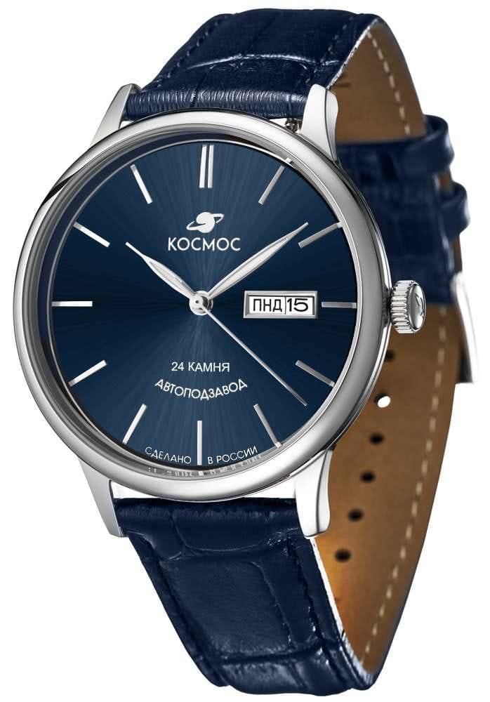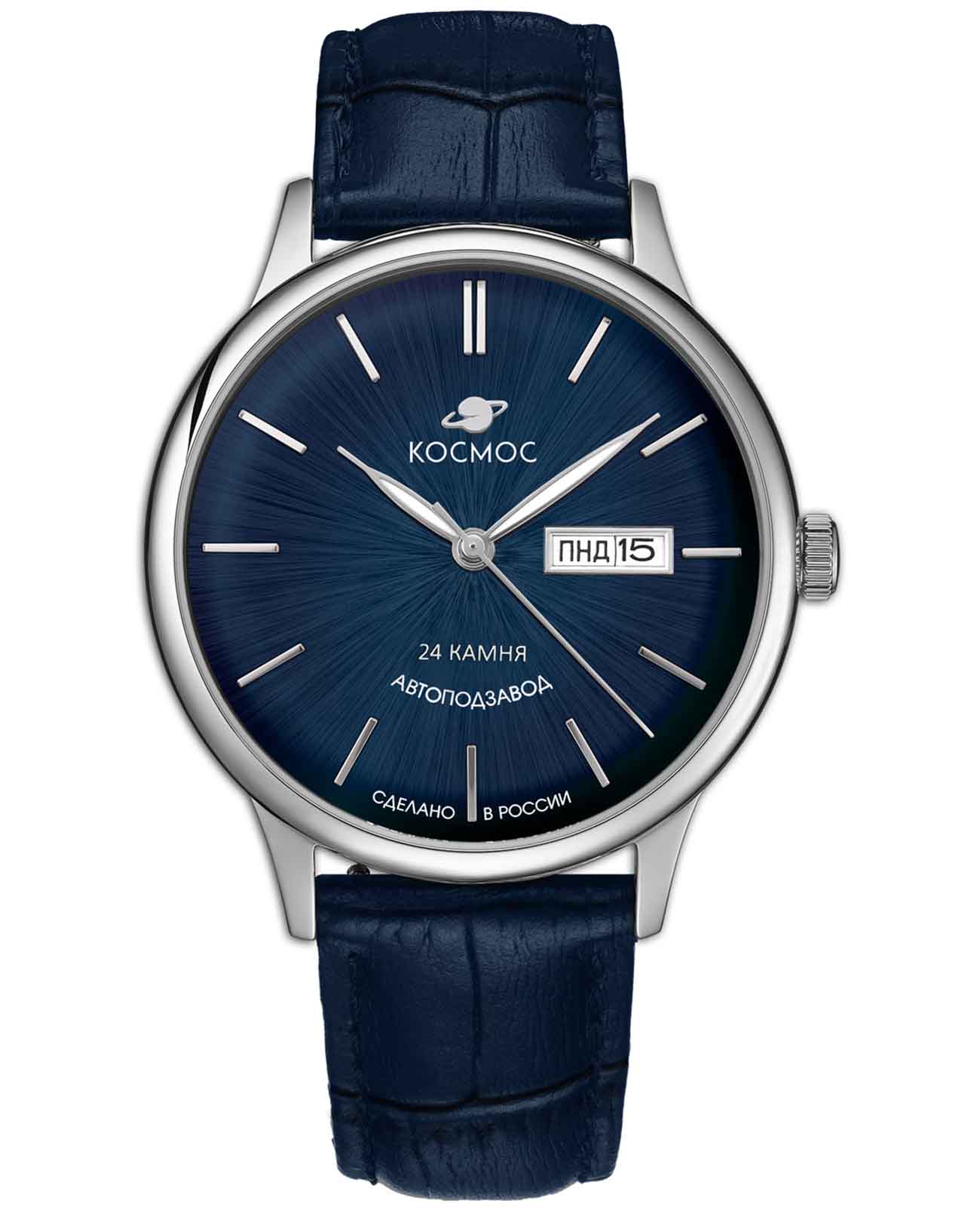 Российские мужские механические часы Космос K 043.16.36 с автоподзаводом оснащены корпусом из нержавеющей стали 316L диаметром 41 мм и защищены минеральным стекломМинеральное стеклоМинеральное стекло представляет собой искусственно выращенный минерал кварца. Такое стекло отличается особой устойчивостью к повреждениям и царапинам. Уступает по некоторым качествам сапфировому стеклу.. Циферблат дополнен функциями отображения даты и дня недели. Стрелки и метки с люминесцентным покрытиемЛюминесцентное покрытиеПозволяет считывать показания времени в темноте. Производители наносят на стрелки, часовые индексы, безель или поверхность циферблата светонакопительный состав, дающий холодное свечение. обеспечивают хорошую видимость в темное время суток. Заводная головка декорирована логотипом бренда в виде стилизованного изображения планеты. Часы имеют водонепроницаемость 50 метров, позволит защитить корпус от случайных брызг или капель дождя. Модель комплектуется ремешком из натуральной кожи на стандартной застежке. Прочный корпус и надежный механизм делают эти часы универсальным аксессуаром для повседневного использования. Уникальный дизайн и высокое качество материалов подчеркивают индивидуальность владельца. Специальные крепежи позволяют легко заменить браслет на часах самостоятельно.