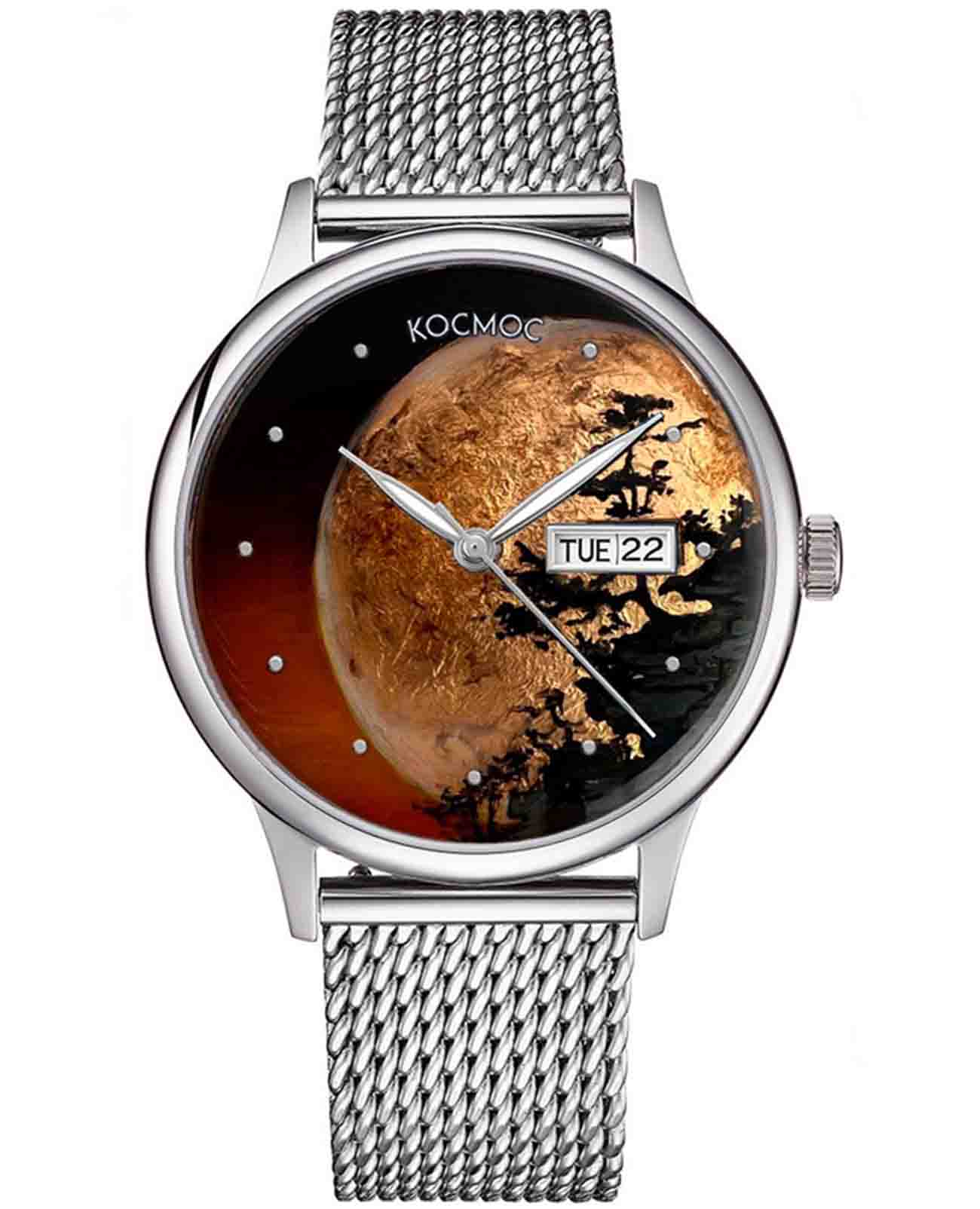 Российские мужские механические часы Космос K 043.1 - Суперлуние с автоподзаводом оснащены корпусом из нержавеющей стали 316L диаметром 41 мм и защищены минеральным стекломМинеральное стеклоМинеральное стекло представляет собой искусственно выращенный минерал кварца. Такое стекло отличается особой устойчивостью к повреждениям и царапинам. Уступает по некоторым качествам сапфировому стеклу.. Коричневый циферблат с золотыми элементами дополнен функциями отображения даты и дня недели, а также специальным изображением планеты, подчеркивающим космическую тематику модели. Заводная головка декорирована логотипом бренда в виде стилизованного изображения планеты с орбитой космического корабля. Часы имеют водонепроницаемость 50 метров, позволит защитить корпус от случайных брызг или капель дождя. Модель комплектуется браслетом из нержавеющей стали 316L с миланским плетением на раскладном замкеРаскладной замокДанный вариант застежки используется только на часах с металлическим браслетом. Отличительная особенность такого крепления в том, что длина браслета становится универсальной и вы можете самостоятельно отрегулировать нужный вам размер – застежка просто двигается по браслету часов.. Специальные крепежи позволяют легко заменить браслет на часах самостоятельно. Прочный корпус и надежный механизм делают эти часы универсальным аксессуаром для повседневного использования. Уникальный дизайн и высокое качество материалов подчеркивают индивидуальность владельца.