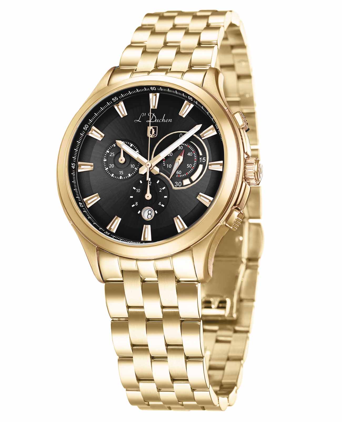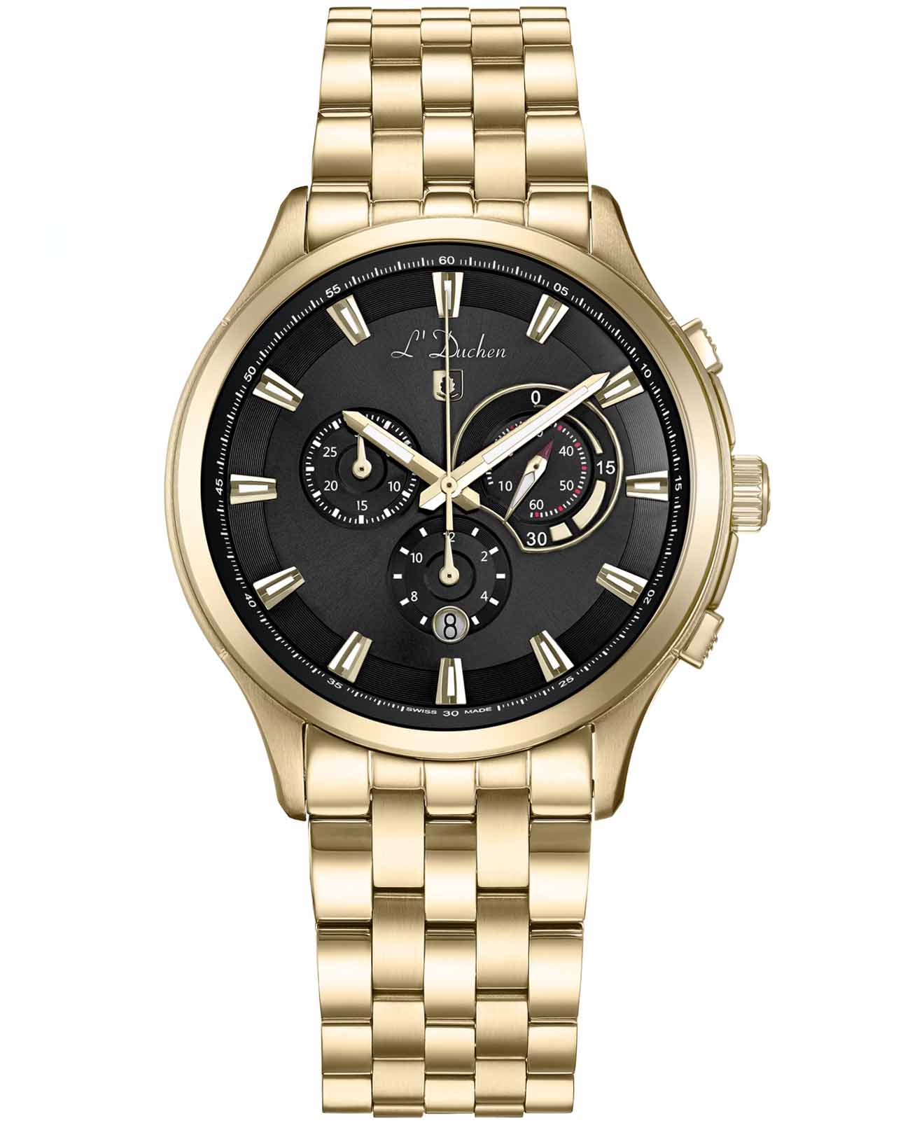Мужские швейцарские часы- хронографХронографФункция позволяет измерять отрезки времени с особой точностью: часы, минуты, секунды. Верным признаком хронографа является наличие на циферблате 3 дополнительных окошек-счётчиков. L'Duchen Pilotage D 742.20.41, кварцевый механизм с высокой точностью. Сапфировое стеклоСапфировое стеклоПрочный и надёжный материал из кристалла сапфира синтетического происхождения, характеризующийся особой твёрдостью и устойчивостью к царапинам и повреждениям. устойчивое к появлению царапин, обладающее высокой прозрачностью. Корпус часов выполнен из нержавеющей стали с PVD-покрытиемPVDУльтратонкое покрытие наносится в технике вакуумного напыления, сочетает в себе нитрид титана особой прочности со слоем золота или оксида хрома. Несёт в себе декоративную или защитную функцию.. Стрелки с люминесцентным покрытиемЛюминесцентное покрытиеПозволяет считывать показания времени в темноте. Производители наносят на стрелки, часовые индексы, безель или поверхность циферблата светонакопительный состав, дающий холодное свечение.. Класс водозащиты: 100 метров, позволит плавать, нырять и заниматься другими водными видами спорта. Стальной браслет с PVD-покрытиемPVDУльтратонкое покрытие наносится в технике вакуумного напыления, сочетает в себе нитрид титана особой прочности со слоем золота или оксида хрома. Несёт в себе декоративную или защитную функцию. на застёжке «бабочка» с кнопкамиЗастёжка "бабочка"Такой вид застёжки дополняется предохранителями, помогающими избежать случайного раскрытия браслета. Обладают изящным исполнением. .