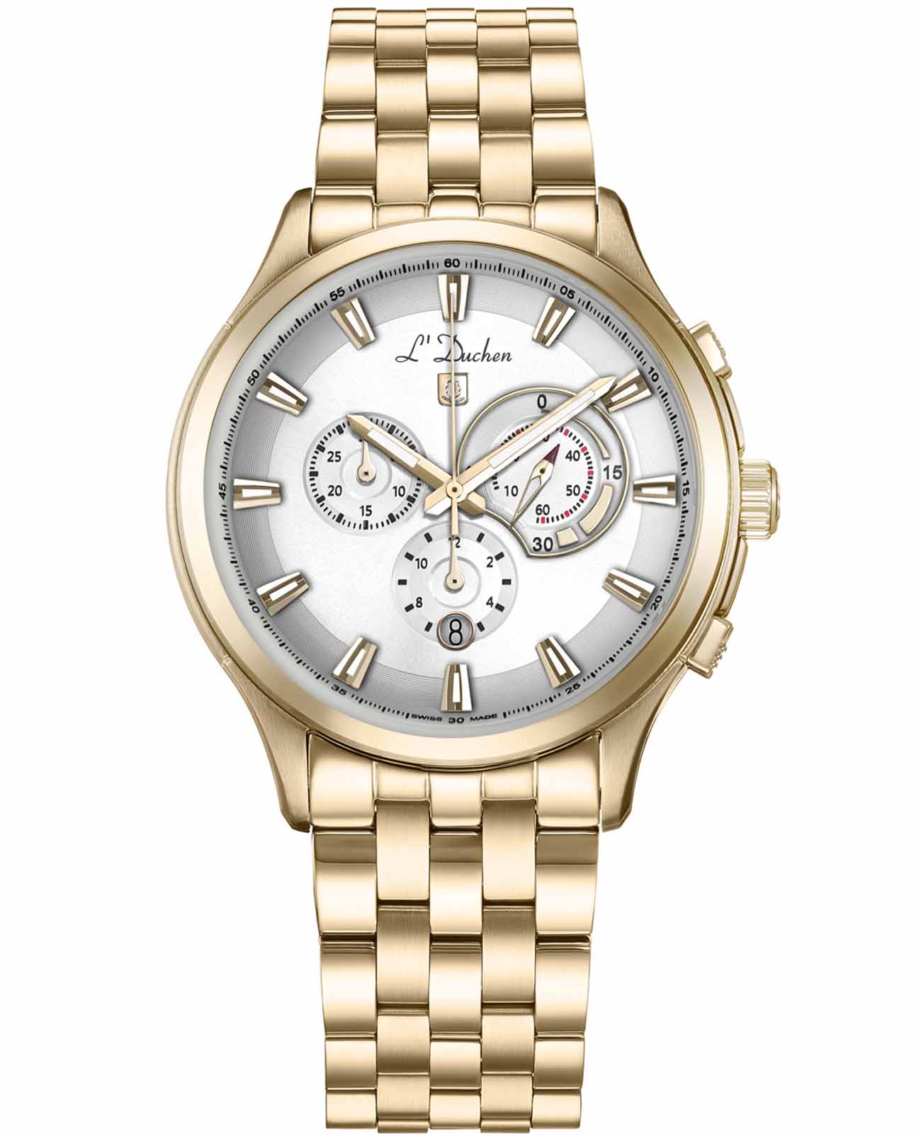 Мужские швейцарские часы- хронографХронографФункция позволяет измерять отрезки времени с особой точностью: часы, минуты, секунды. Верным признаком хронографа является наличие на циферблате 3 дополнительных окошек-счётчиков. L'Duchen Pilotage D 742.20.43, кварцевый механизм с высокой точностью. Сапфировое стеклоСапфировое стеклоПрочный и надёжный материал из кристалла сапфира синтетического происхождения, характеризующийся особой твёрдостью и устойчивостью к царапинам и повреждениям. устойчивое к появлению царапин, обладающее высокой прозрачностью. Корпус часов выполнен из нержавеющей стали с PVD-покрытиемPVDУльтратонкое покрытие наносится в технике вакуумного напыления, сочетает в себе нитрид титана особой прочности со слоем золота или оксида хрома. Несёт в себе декоративную или защитную функцию.. Стрелки с люминесцентным покрытиемЛюминесцентное покрытиеПозволяет считывать показания времени в темноте. Производители наносят на стрелки, часовые индексы, безель или поверхность циферблата светонакопительный состав, дающий холодное свечение.. Класс водозащиты: 100 метров, позволит плавать, нырять и заниматься другими водными видами спорта. Стальной браслет с PVD-покрытиемPVDУльтратонкое покрытие наносится в технике вакуумного напыления, сочетает в себе нитрид титана особой прочности со слоем золота или оксида хрома. Несёт в себе декоративную или защитную функцию. на застёжке «бабочка» с кнопкамиЗастёжка "бабочка"Такой вид застёжки дополняется предохранителями, помогающими избежать случайного раскрытия браслета. Обладают изящным исполнением. .