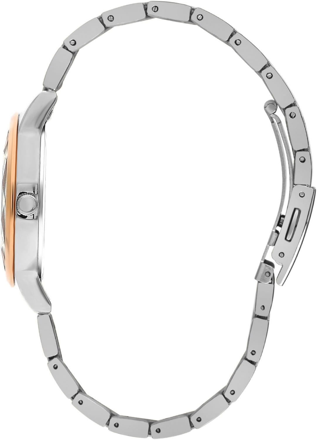 Женские часы Lee Cooper LC07501.530 — это стильное сочетание элегантности и современного дизайна. Круглый корпус диаметром 34 мм выполнен из суперметалла в серебристом цвете, а неподвижный безельБезельВнешний ободок, закрепляющий стекло. В спортивных часах так называется поворотное кольцо с делениями на циферблате, выполняет роль таймера – замеряет отрезки времени на шкале. Неподвижный безель – элемент декора. Однонаправленно вращающийся безель на дайверских часах позволяет фиксировать моменты погружения и выныривания на поверхность. с IP-покрытиемIP-покрытиеМетод ионного напыления. Демонстрирует повышенную устойчивость к истиранию, окислению и химическим веществам. Под воздействием высокого давления и температуры около 1500°C молекулы металла надёжно соединяются с частицами корпуса часов. цвета розового золота, придает модели особый блеск. Серебристый циферблат защищен минеральным стекломМинеральное стеклоМинеральное стекло представляет собой искусственно выращенный минерал кварца. Такое стекло отличается особой устойчивостью к повреждениям и царапинам. Уступает по некоторым качествам сапфировому стеклу., обеспечивающим устойчивость к царапинам. Метки инкрустированы цирконами. Часы оснащены надежным кварцевым механизмом, а металлический браслет с частичным IP-покрытиемIP-покрытиеМетод ионного напыления. Демонстрирует повышенную устойчивость к истиранию, окислению и химическим веществам. Под воздействием высокого давления и температуры около 1500°C молекулы металла надёжно соединяются с частицами корпуса часов. на раскладной застёжкеРаскладная застёжкаТакой тип застёжки используется только на браслетах из металла. Она никогда не раскрывается полностью, происходит разделение на 2 и более частей. Раскладывающая застёжка снизит вероятность потери часов к минимуму. гарантирует комфортную посадку на запястье. Водозащита 30 метров защищает модель от случайных брызг и дождя. Lee Cooper — отличный выбор для тех, кто ценит утонченность и качество.