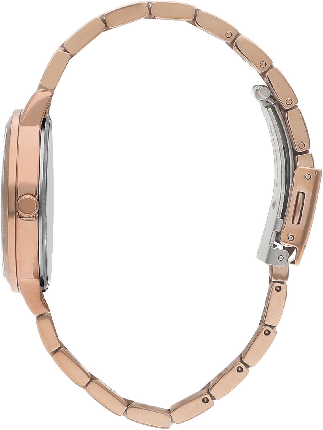 Женские часы Lee Cooper LC07580.430 — это стильное сочетание элегантности и современного дизайна. Круглый корпус диаметром 35 мм выполнен из суперметалла с IP-покрытиемIP-покрытиеМетод ионного напыления. Демонстрирует повышенную устойчивость к истиранию, окислению и химическим веществам. Под воздействием высокого давления и температуры около 1500°C молекулы металла надёжно соединяются с частицами корпуса часов. цвета розового золота, что придает модели особый блеск. Серебристый циферблат с минималистичными метками придает часам элегантность и утонченность, делая их идеальным аксессуаром для любой женщины, а минеральное стеклоМинеральное стеклоМинеральное стекло представляет собой искусственно выращенный минерал кварца. Такое стекло отличается особой устойчивостью к повреждениям и царапинам. Уступает по некоторым качествам сапфировому стеклу., обеспечиваюет устойчивость к царапинам. Центральные часовая, минутная и секундная стрелки. Часы оснащены надежным кварцевым механизмом, источник питания - батарейка, а металлический браслет с IP-покрытиемIP-покрытиеМетод ионного напыления. Демонстрирует повышенную устойчивость к истиранию, окислению и химическим веществам. Под воздействием высокого давления и температуры около 1500°C молекулы металла надёжно соединяются с частицами корпуса часов. на раскладной застёжкеРаскладная застёжкаТакой тип застёжки используется только на браслетах из металла. Она никогда не раскрывается полностью, происходит разделение на 2 и более частей. Раскладывающая застёжка снизит вероятность потери часов к минимуму. гарантирует комфортную посадку на запястье. Водозащита 30 метров защищает модель от случайных брызг и дождя. Lee Cooper — отличный выбор для тех, кто ценит утонченность и качество.