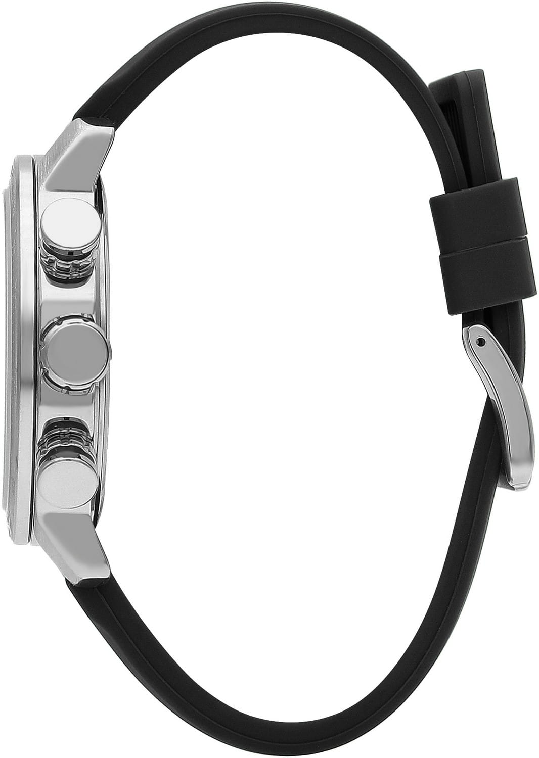 Lee Cooper LC07631.351  — элегантная модель с функциональными возможностями для повседневного использования. Корпус из суперметалла диаметром 49 мм придаёт часам классический и современный вид. Циферблат защищён минеральным стекломМинеральное стеклоМинеральное стекло представляет собой искусственно выращенный минерал кварца. Такое стекло отличается особой устойчивостью к повреждениям и царапинам. Уступает по некоторым качествам сапфировому стеклу., устойчивым к царапинам, хорошо может выдержать небольшие удары и падения. Стильный циферблат оформлен изысканными индексами и дополнен окошками даты, дня недели и 24-часового индикатора, а также аккуратными метками и стрелками с люминесцентным покрытиемЛюминесцентное покрытиеПозволяет считывать показания времени в темноте. Производители наносят на стрелки, часовые индексы, безель или поверхность циферблата светонакопительный состав, дающий холодное свечение., что гарантирует читаемость даже в условиях недостаточного освещения. Функция второго часового поясаВторой часовой поясФункция, позволяющая отображать время двух часовых поясов одновременно. делает часы удобными для путешественников. Часы работают на кварцевом механизме, обеспечивающем точность хода. Каучуковый ремешок на стандартной застёжке гарантирует удобную посадку и надёжную фиксацию на запястье. Водозащита 50 метров защищает часы от брызг и дождя, делая их подходящими для повседневного использования.