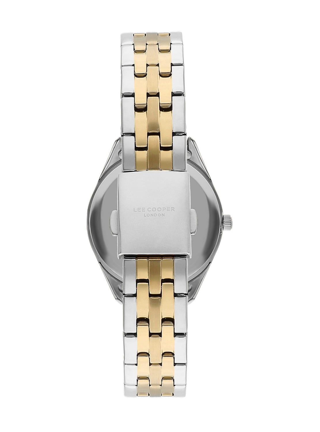 Женские часы Lee Cooper LC07833.230 — это стильное сочетание элегантности и современного дизайна. Изысканный круглый корпус диаметром 34 мм выполнен из суперметалла с неподвижным безелемБезельВнешний ободок, закрепляющий стекло. В спортивных часах так называется поворотное кольцо с делениями на циферблате, выполняет роль таймера – замеряет отрезки времени на шкале. Неподвижный безель – элемент декора. Однонаправленно вращающийся безель на дайверских часах позволяет фиксировать моменты погружения и выныривания на поверхность. с IP-покрытиемIP-покрытиеМетод ионного напыления. Демонстрирует повышенную устойчивость к истиранию, окислению и химическим веществам. Под воздействием высокого давления и температуры около 1500°C молекулы металла надёжно соединяются с частицами корпуса часов. золотого цвета, что придает модели особый блеск. Серебристый циферблат защищен минеральным стекломМинеральное стеклоМинеральное стекло представляет собой искусственно выращенный минерал кварца. Такое стекло отличается особой устойчивостью к повреждениям и царапинам. Уступает по некоторым качествам сапфировому стеклу., обеспечивающим устойчивость к царапинам. Метки в виде лаконичных штрихов. Часы оснащены надежным кварцевым механизмом, а изящный стальной браслет с частичным IP-покрытиемIP-покрытиеМетод ионного напыления. Демонстрирует повышенную устойчивость к истиранию, окислению и химическим веществам. Под воздействием высокого давления и температуры около 1500°C молекулы металла надёжно соединяются с частицами корпуса часов. на раскладной застёжкеРаскладная застёжкаТакой тип застёжки используется только на браслетах из металла. Она никогда не раскрывается полностью, происходит разделение на 2 и более частей. Раскладывающая застёжка снизит вероятность потери часов к минимуму. гарантирует комфортную посадку на запястье. Водозащита 30 метров защищает модель от случайных брызг и дождя. Lee Cooper — отличный выбор для тех, кто ценит утонченность и качество.