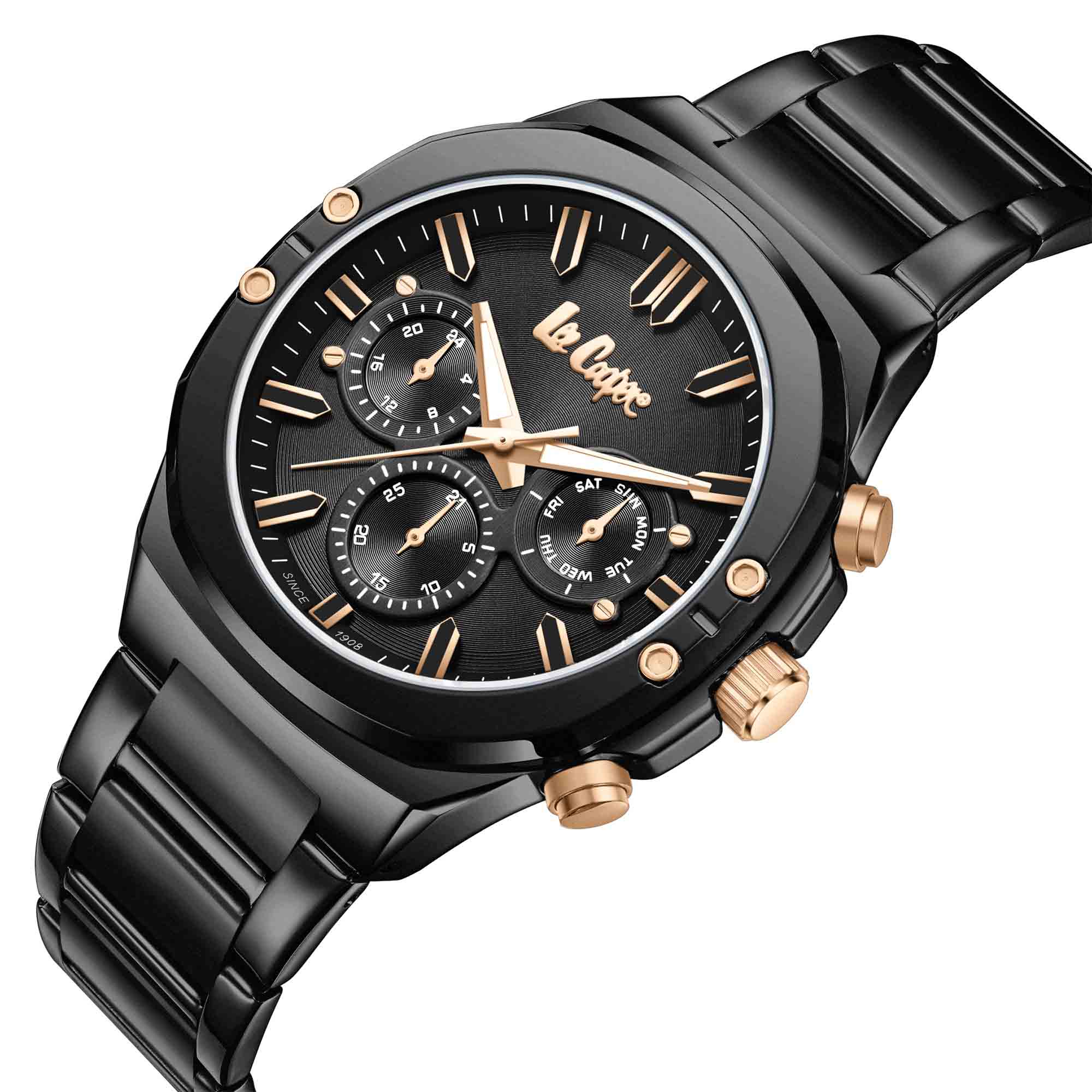 Мужские часы Lee Cooper LC07991.650 — это идеальный аксессуар для современного мужчины, ценящего моду и элегантность. Модель создана с учетом последних трендов и отличается высоким качеством материалов и сборки. Часы оснащены кварцевым механизмом, обеспечивающим точный ход и минимальное техническое обслуживание. Корпус круглой формы имеет диаметр 43 мм , изготовлен из нержавеющей стали с IP-покрытием IP-покрытиемIP-покрытиеМетод ионного напыления. Демонстрирует повышенную устойчивость к истиранию, окислению и химическим веществам. Под воздействием высокого давления и температуры около 1500°C молекулы металла надёжно соединяются с частицами корпуса часов. чёрного цвета, что придаёт ему глубину и благородство. Браслет также выполнен из нержавеющей стали с чёрным покрытием и дополнен раскладной застёжкойРаскладная застёжкаТакой тип застёжки используется только на браслетах из металла. Она никогда не раскрывается полностью, происходит разделение на 2 и более частей. Раскладывающая застёжка снизит вероятность потери часов к минимуму. для удобства ношения. Циферблат чёрного цвета оформлен со вкусом: часовые метки выполнены в виде линейных индексов, что делает его минималистичным и легким к восприятию. Отсутствие лишних деталей подчеркивает строгость дизайна и делает его универсальным элементом стиля. Защиту циферблата обеспечивает минеральное стекло минеральное стеклоМинеральное стеклоМинеральное стекло представляет собой искусственно выращенный минерал кварца. Такое стекло отличается особой устойчивостью к повреждениям и царапинам. Уступает по некоторым качествам сапфировому стеклу., устойчивое к мелким повреждениям и царапинам. Водозащита позволяет использовать часы в повседневных условиях без риска повреждения от случайных брызг воды. Благодаря чёрному цвету корпуса, браслета и циферблата, часы выглядят целостно и стильно — они одинаково хорошо подойдут как к деловому, так и к неформальному образу. Это не просто средство измерения времени — это стильный аксессуар, подчёркивающий ваш вкус и внимание к деталям.