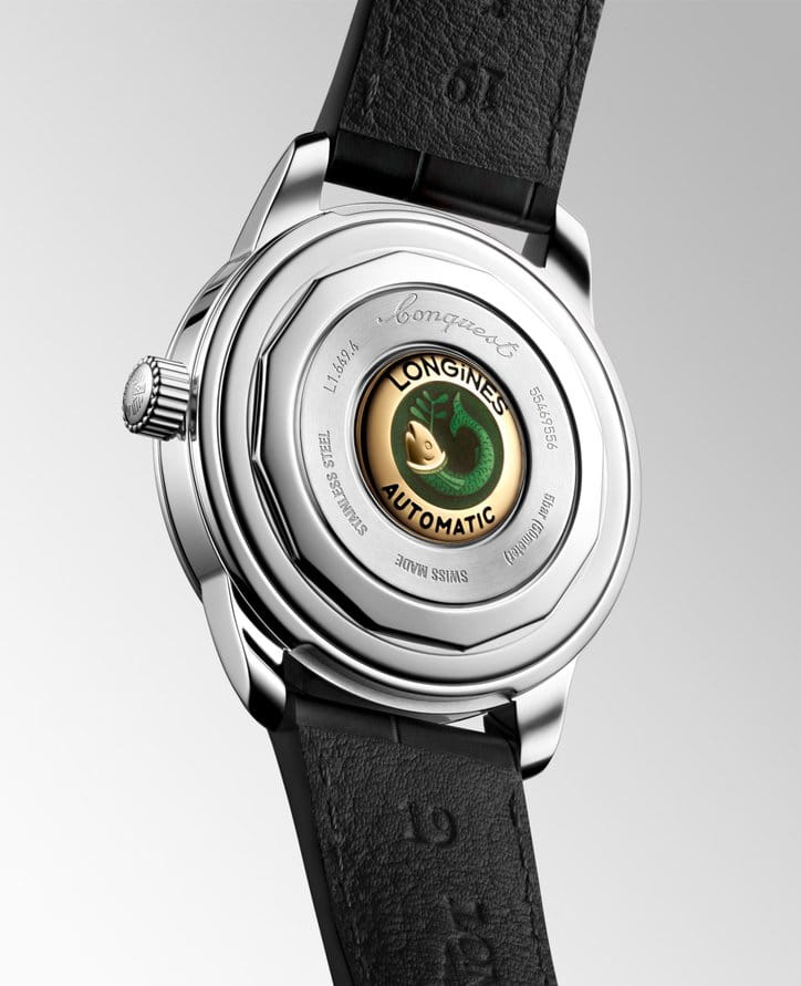 Ремешок из натуральной кожи с текстурой аллигатора дополнен классической пряжкой. Задняя крышка украшена характерным медальоном с логотипом Longines.
