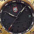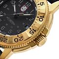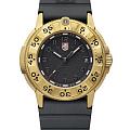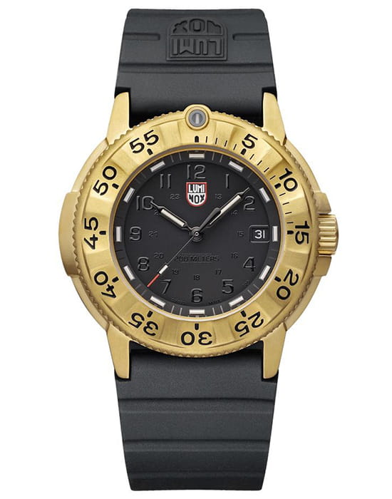 Luminox XS.3221.NSF — мужская модель серии Navy SEAL Foundation, сочетающая функциональность дайверских часов и выразительный дизайн. Корпус диаметром 43 мм выполнен из нержавеющей стали с жёлтым PVDPVDУльтратонкое покрытие наносится в технике вакуумного напыления, сочетает в себе нитрид титана особой прочности со слоем золота или оксида хрома. Несёт в себе декоративную или защитную функцию.-покрытием, а односторонний вращающийся безельБезельВнешний ободок, закрепляющий стекло. В спортивных часах так называется поворотное кольцо с делениями на циферблате, выполняет роль таймера – замеряет отрезки времени на шкале. Неподвижный безель – элемент декора. Однонаправленно вращающийся безель на дайверских часах позволяет фиксировать моменты погружения и выныривания на поверхность. с минутной шкалой обеспечивает удобство при работе под водой. Защитную функцию выполняет сапфировое стеклоСапфировое стеклоПрочный и надёжный материал из кристалла сапфира синтетического происхождения, характеризующийся особой твёрдостью и устойчивостью к царапинам и повреждениям., устойчивое к царапинам и дополненное антибликовым покрытием для лучшей читаемости. Водозащита 200 м (20 бар) делает модель надёжным инструментом для дайвинга. Часы оснащены швейцарским кварцевым механизмом с индикацией часов, минут, секунд и даты. Стрелки и метки имеют люминесцентное покрытиеЛюминесцентное покрытиеПозволяет считывать показания времени в темноте. Производители наносят на стрелки, часовые индексы, безель или поверхность циферблата светонакопительный состав, дающий холодное свечение. с системой постоянной подсветки Luminox Light Technology, обеспечивающей читаемость в любых условиях, включая полную темноту. Модель дополнена каучуковым ремешком с классической застёжкой, обеспечивающим комфортное ношение и долговечность.