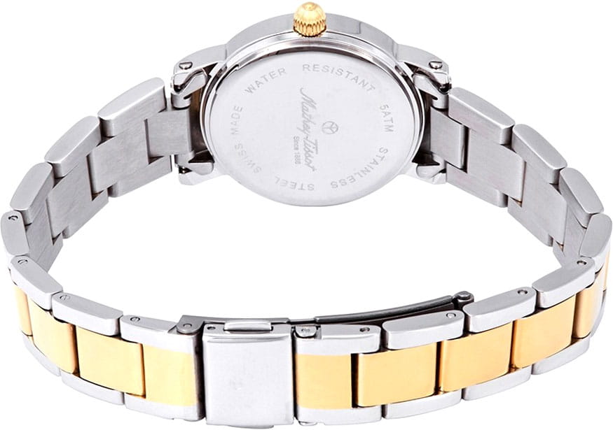 Женские кварцевые часы Mathey-Tissot City Metal D31186MBN — это стильное сочетание элегантности и современного дизайна. Изящный корпус выполнен из стали 316L с безелемБезельВнешний ободок, закрепляющий стекло. В спортивных часах так называется поворотное кольцо с делениями на циферблате, выполняет роль таймера – замеряет отрезки времени на шкале. Неподвижный безель – элемент декора. Однонаправленно вращающийся безель на дайверских часах позволяет фиксировать моменты погружения и выныривания на поверхность. с PVD-покрытиемPVDУльтратонкое покрытие наносится в технике вакуумного напыления, сочетает в себе нитрид титана особой прочности со слоем золота или оксида хрома. Несёт в себе декоративную или защитную функцию., что придаст образу женственности и романтизма. Изысканный циферблат с метками в виде штрихов придает модели особый блеск и защищен минеральным стекломМинеральное стеклоМинеральное стекло представляет собой искусственно выращенный минерал кварца. Такое стекло отличается особой устойчивостью к повреждениям и царапинам. Уступает по некоторым качествам сапфировому стеклу., обеспечивающим устойчивость к царапинам. Часы оснащены надежным кварцевым механизмом. Окошко даты находится в положении 3 часа. Стальной браслет с частичным PVD-покрытиемPVDУльтратонкое покрытие наносится в технике вакуумного напыления, сочетает в себе нитрид титана особой прочности со слоем золота или оксида хрома. Несёт в себе декоративную или защитную функцию. на раскладной застёжкеРаскладная застёжкаТакой тип застёжки используется только на браслетах из металла. Она никогда не раскрывается полностью, происходит разделение на 2 и более частей. Раскладывающая застёжка снизит вероятность потери часов к минимуму., гарантирующего комфортное и безопасное ношение. Класс водозащиты: 50 метров позволит защитить корпус от случайных брызг или капель дождя. Mathey-Tissot — отличный выбор для тех, кто ценит утонченность и качество.