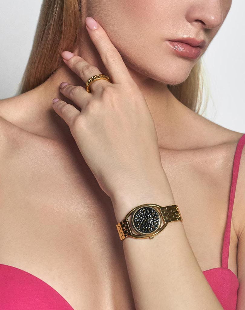 Женские кварцевые часы Mathey-Tissot Saphira D933PYN — это стильное сочетание элегантности и современного дизайна. Изящный корпус выполнен из стали с PVD-покрытиемPVDУльтратонкое покрытие наносится в технике вакуумного напыления, сочетает в себе нитрид титана особой прочности со слоем золота или оксида хрома. Несёт в себе декоративную или защитную функцию. и прекрасно впишется в ваш исключительный стиль. Изысканный циферблат с метками придает модели особый блеск и защищен минеральным стекломМинеральное стеклоМинеральное стекло представляет собой искусственно выращенный минерал кварца. Такое стекло отличается особой устойчивостью к повреждениям и царапинам. Уступает по некоторым качествам сапфировому стеклу., обеспечивающим устойчивость к царапинам. Циферблат украшен декоративным узором. Мечевидные стрелки в стиле Sword с люминесцентным покрытиемЛюминесцентное покрытиеПозволяет считывать показания времени в темноте. Производители наносят на стрелки, часовые индексы, безель или поверхность циферблата светонакопительный состав, дающий холодное свечение., которое светится в темноте после непродолжительной зарядки на свету. Часы оснащены надежным кварцевым механизмом. Стальной браслет с PVD-покрытиемPVDУльтратонкое покрытие наносится в технике вакуумного напыления, сочетает в себе нитрид титана особой прочности со слоем золота или оксида хрома. Несёт в себе декоративную или защитную функцию. на застёжке-бабочке с кнопкамиЗастёжка "бабочка"Такой вид застёжки дополняется предохранителями, помогающими избежать случайного раскрытия браслета. Обладают изящным исполнением. гарантирует комфортное и безопасное ношение. Класс водозащиты: 50 метров позволит защитить корпус от случайных брызг или капель дождя. Mathey-Tissot — отличный выбор для тех, кто ценит утонченность и качество.