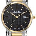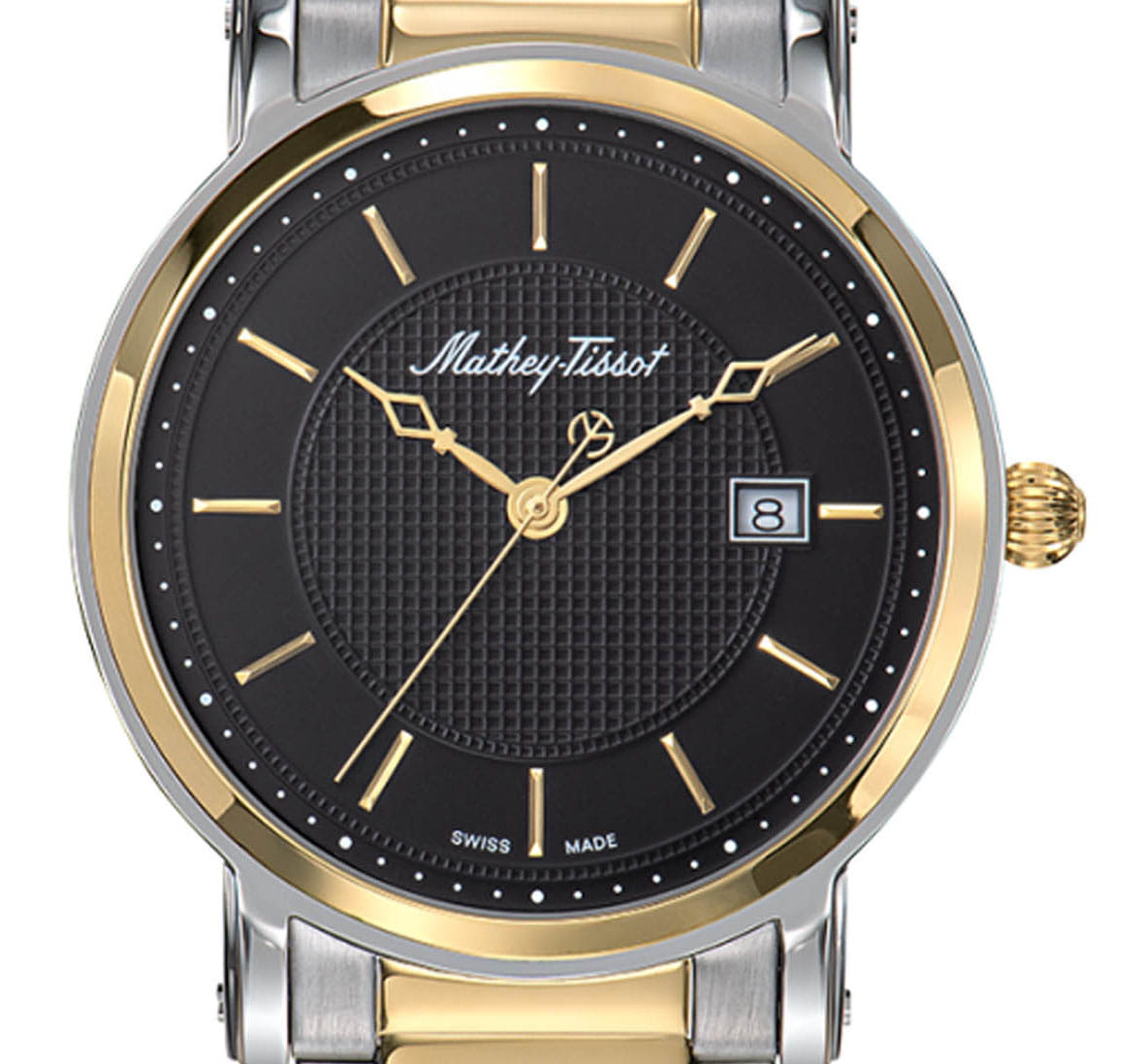 Мужские кварцевые часы Mathey-Tissot City H611251MBN — это стильное сочетание элегантности и современного дизайна. Изящный корпус выполнен из нержавеющей стали серебристого цвета, диаметром 38 мм, что придаст образу элегантности и надежности. Изысканный циферблат с метками в виде штрихов придает модели особый блеск. Циферблат защищен минеральным стекломМинеральное стеклоМинеральное стекло представляет собой искусственно выращенный минерал кварца. Такое стекло отличается особой устойчивостью к повреждениям и царапинам. Уступает по некоторым качествам сапфировому стеклу. с сапфировым покрытием, обеспечивающий устойчивость к царапинам. БезельБезельВнешний ободок, закрепляющий стекло. В спортивных часах так называется поворотное кольцо с делениями на циферблате, выполняет роль таймера – замеряет отрезки времени на шкале. Неподвижный безель – элемент декора. Однонаправленно вращающийся безель на дайверских часах позволяет фиксировать моменты погружения и выныривания на поверхность. с PVD-покрытиемPVDУльтратонкое покрытие наносится в технике вакуумного напыления, сочетает в себе нитрид титана особой прочности со слоем золота или оксида хрома. Несёт в себе декоративную или защитную функцию. золотистого цвета. Окошко даты находится в положении 3 часа. Часы оснащены надежным кварцевым механизмом. Стальной браслет с частичным PVD-покрытиемPVDУльтратонкое покрытие наносится в технике вакуумного напыления, сочетает в себе нитрид титана особой прочности со слоем золота или оксида хрома. Несёт в себе декоративную или защитную функцию. на раскладной застёжкеРаскладная застёжкаТакой тип застёжки используется только на браслетах из металла. Она никогда не раскрывается полностью, происходит разделение на 2 и более частей. Раскладывающая застёжка снизит вероятность потери часов к минимуму., гарантирует комфортное и безопасное ношение. Класс водозащиты: 30 метров позволит защитить корпус от случайных брызг или капель дождя. Mathey-Tissot  — отличный выбор для тех, кто ценит утонченность и качество.