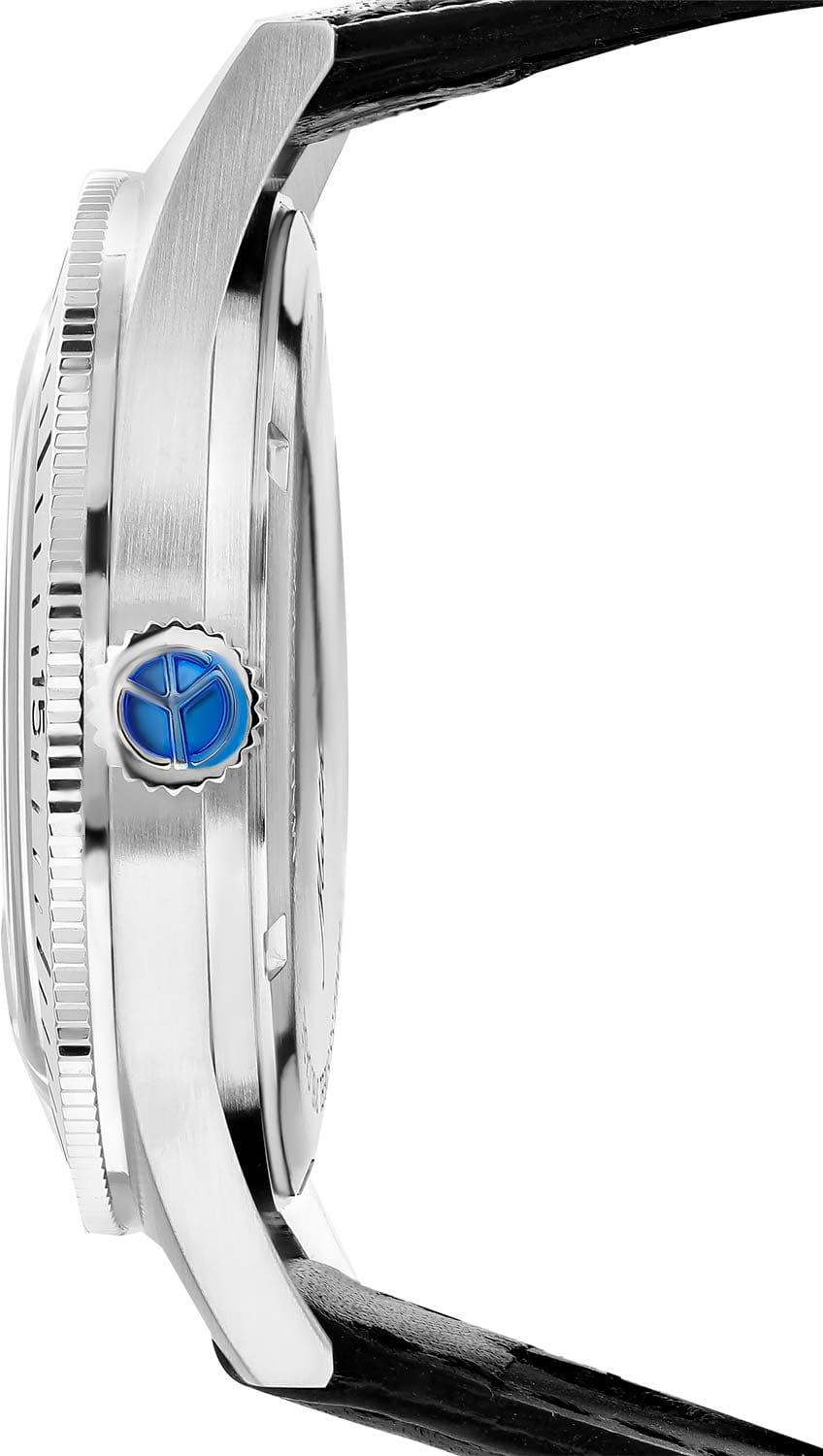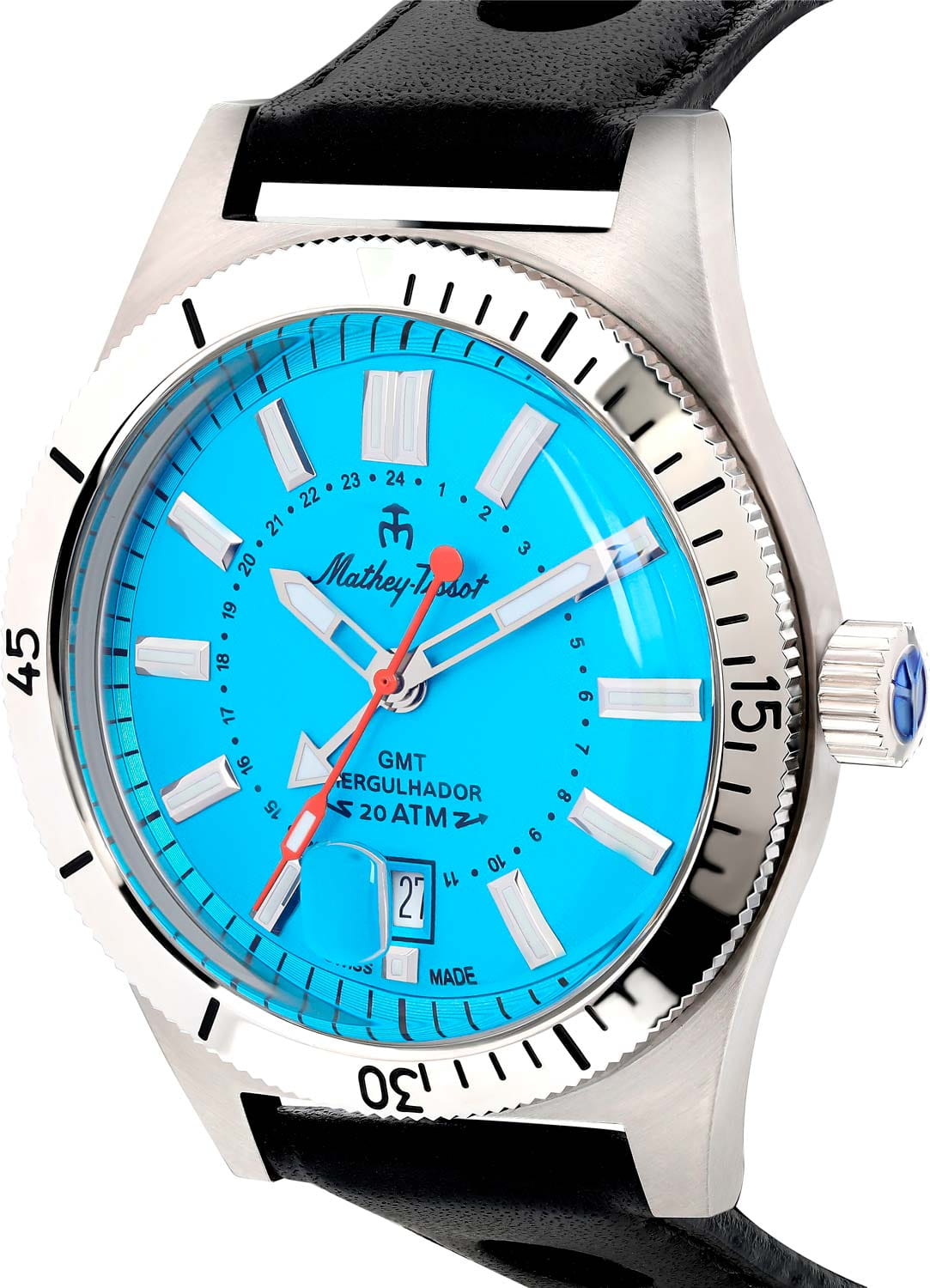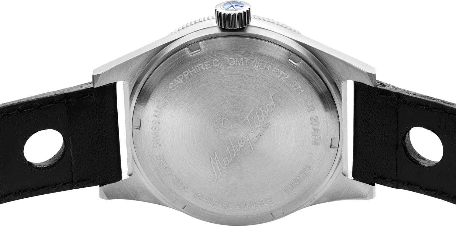 Мужские кварцевые часы Mathey-Tissot Mergulhador GMTGMTОтображение времени второго часового пояса.Такая функция особенно актуальна для путешественников и бизнесменов,которые общаются с людьми из разных стран,теперь вы всегда будете знать,какой час у вашего партнёра или близкого человека. MRGSK — это стильное сочетание элегантности и современного дизайна. Изящный корпус выполнен из нержавеющей стали, диаметром 41 мм, что придаст образу элегантности и надежности. Циферблат с метками в виде штрихов придает модели особый блеск. Циферблат защищен минеральным стекломМинеральное стеклоМинеральное стекло представляет собой искусственно выращенный минерал кварца. Такое стекло отличается особой устойчивостью к повреждениям и царапинам. Уступает по некоторым качествам сапфировому стеклу. с сапфировым покрытием, обеспечивает устойчивость к царапинам. Второй часовой поясВторой часовой поясФункция, позволяющая отображать время двух часовых поясов одновременно. в 24-х часовом формате времени отображается центральной стрелкой. Стрелки и метки с люминесцентным покрытиемЛюминесцентное покрытиеПозволяет считывать показания времени в темноте. Производители наносят на стрелки, часовые индексы, безель или поверхность циферблата светонакопительный состав, дающий холодное свечение. SuperLumiNova, которое светится в темноте после непродолжительной зарядки на свету. Окошко даты находится в положении 6 часов.  Рифленый безельБезельВнешний ободок, закрепляющий стекло. В спортивных часах так называется поворотное кольцо с делениями на циферблате, выполняет роль таймера – замеряет отрезки времени на шкале. Неподвижный безель – элемент декора. Однонаправленно вращающийся безель на дайверских часах позволяет фиксировать моменты погружения и выныривания на поверхность. с минутными отметками вращается в одном направлении. Часы оснащены надежным кварцевым механизмом. Кожаный ремешок на стандартной застёжке гарантирует комфортное и безопасное ношение. Класс водозащиты: 200 метров позволит плавать, нырять и заниматься другими водными видами спорта. Mathey-Tissot  — отличный выбор для тех, кто ценит утонченность и качество.