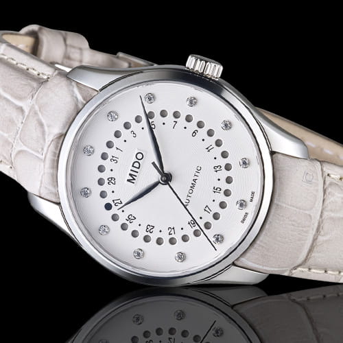Женские швейцарские механические часы с системой автоматического подзавода Mido Belluna M024.207.16.036.00, механический механизм (автоматический калибр) с высокой точностью. Сапфировое стеклоСапфировое стеклоПрочный и надёжный материал из кристалла сапфира синтетического происхождения, характеризующийся особой твёрдостью и устойчивостью к царапинам и повреждениям. устойчивое к появлению царапин, обладающее высокой прозрачностью. Класс водозащиты: 50 метров, позволит защитить корпус от случайных брызг или капель дождя. Корпус часов изготовлен из стали. Шикарная классика в стильном исполнении. Бриллианты вместо разметки. Циферблат выполнен с расходящимся гильоше волнами. Индикация даты выполнена в виде апертуры.