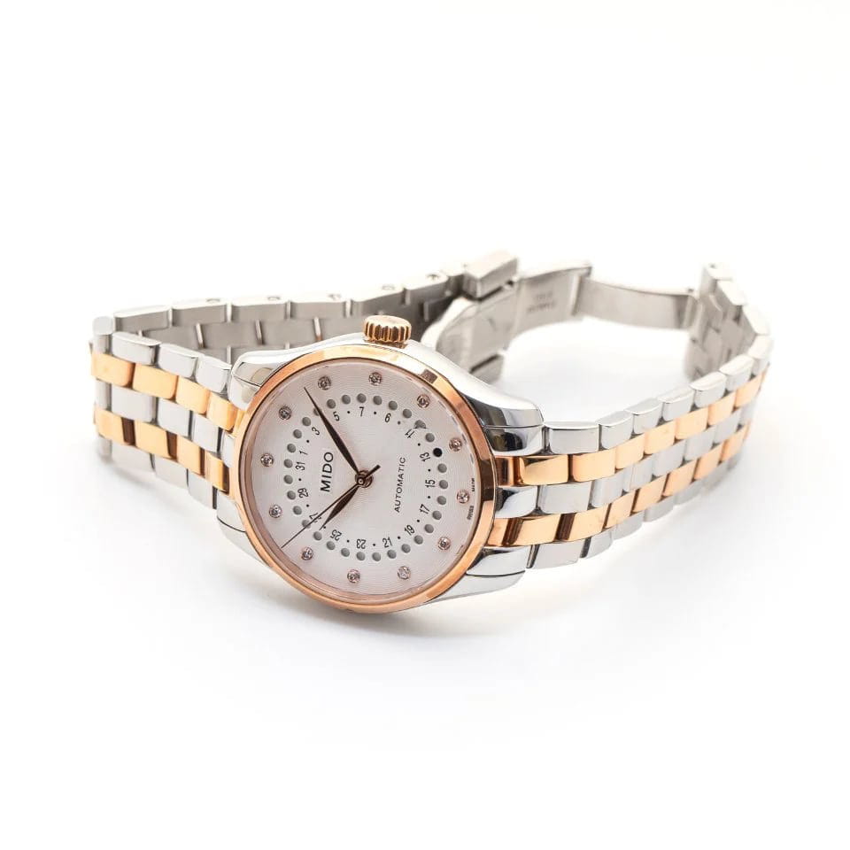 Женские швейцарские механические часы Mido Belluna II M024.207.22.036.00, механический механизм (автоматический калибр) с высокой точностью. Сапфировое стеклоСапфировое стеклоПрочный и надёжный материал из кристалла сапфира синтетического происхождения, характеризующийся особой твёрдостью и устойчивостью к царапинам и повреждениям. устойчивое к появлению царапин, обладающее высокой прозрачностью. Класс водозащиты: 50 метров, позволит защитить корпус от случайных брызг или капель дождя. Корпус часов изготовлен из стали. БезельБезельВнешний ободок, закрепляющий стекло. В спортивных часах так называется поворотное кольцо с делениями на циферблате, выполняет роль таймера – замеряет отрезки времени на шкале. Неподвижный безель – элемент декора. Однонаправленно вращающийся безель на дайверских часах позволяет фиксировать моменты погружения и выныривания на поверхность. с PVD-покрытиемPVDУльтратонкое покрытие наносится в технике вакуумного напыления, сочетает в себе нитрид титана особой прочности со слоем золота или оксида хрома. Несёт в себе декоративную или защитную функцию.. Стальной браслет на раскладной застёжкеРаскладная застёжкаТакой тип застёжки используется только на браслетах из металла. Она никогда не раскрывается полностью, происходит разделение на 2 и более частей. Раскладывающая застёжка снизит вероятность потери часов к минимуму. с PVD-покрытиемPVDУльтратонкое покрытие наносится в технике вакуумного напыления, сочетает в себе нитрид титана особой прочности со слоем золота или оксида хрома. Несёт в себе декоративную или защитную функцию.. Указатели дня недели и даты расположены в центре циферблата. Циферблат инкрустирован бриллиантами.