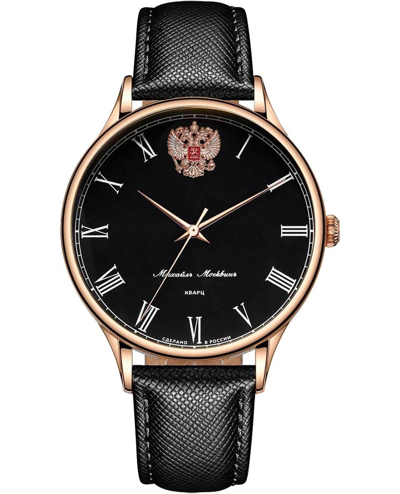 Мужские кварцевые часы Михаил Москвин Classic 1310B3L9 изысканная классика для делового мужчины с уважением к традициям. Круглый корпус диаметром 43 мм из гипоаллергенной латуни с IP-покрытиемIP-покрытиеМетод ионного напыления. Демонстрирует повышенную устойчивость к истиранию, окислению и химическим веществам. Под воздействием высокого давления и температуры около 1500°C молекулы металла надёжно соединяются с частицами корпуса часов., придающим благородное золотистое сияние. Чёрный циферблат с римскими цифрами, где отметка «12» выполнена в виде герба Российской Федерации - деликатный, но выразительный патриотический акцент. Стекло минеральноеМинеральное стеклоМинеральное стекло представляет собой искусственно выращенный минерал кварца. Такое стекло отличается особой устойчивостью к повреждениям и царапинам. Уступает по некоторым качествам сапфировому стеклу., устойчивое к царапинам. Механизм японский кварцевый Epson AL21E2D, обеспечивающий точность и долговечность. Центральные часовая и минутная стрелки. Рифлёная заводная головка и стальная задняя крышка подчёркивают надёжность конструкции. Ремешок из натуральной итальянской кожи на стандартной застёжке обеспечивает комфорт и элегантную посадку. Водонепроницаемость 30 м (3 ATM) - защита от брызг и дождя. Идеальный выбор для офиса и официальных встреч - часы, в которых классический дизайн, российская идентичность и японская точность встречаются в гармонии.