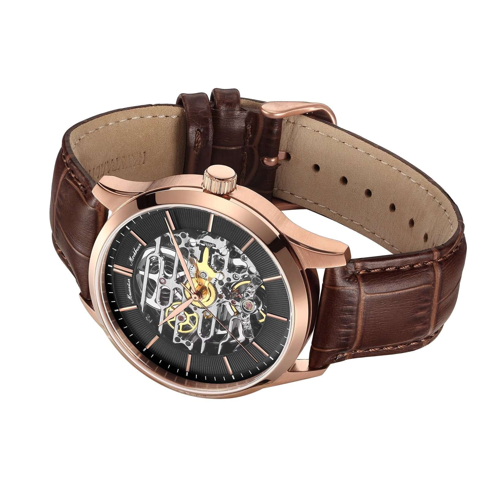 Корпус мужских часов Mikhail Moskvin 1507S3L5 выполнен из нержавеющей стали с ip-покрытиемIP-покрытиеМетод ионного напыления. Демонстрирует повышенную устойчивость к истиранию, окислению и химическим веществам. Под воздействием высокого давления и температуры около 1500°C молекулы металла надёжно соединяются с частицами корпуса часов., диаметром 43 мм, золотого цвета. Механизм механический с автоподзаводом, возможен ручной завод. Циферблат чёрного цвета стрелочный с метками, защищён минеральным стекломМинеральное стеклоМинеральное стекло представляет собой искусственно выращенный минерал кварца. Такое стекло отличается особой устойчивостью к повреждениям и царапинам. Уступает по некоторым качествам сапфировому стеклу.. Модель имеет скелетонизированный дизайн, рифленую заводную головку. Ремень из натуральной кожи с имитацией кожи крокодила шириной 22 мм со стандартной застёжкой, максимальный обхват запястья 220 мм. Водозащита 5 АТМ, рассчитана на защиту от брызг и дождя.
