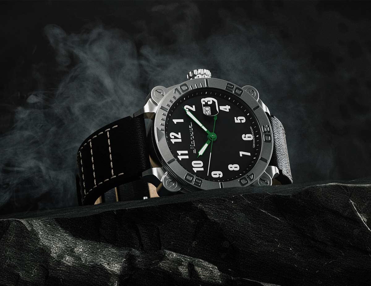 Мужские механические часы с автоподзаводом от бренда «МОЛНИЯ» — это стильный аксессуар, вдохновлённый дизайном приборной панели легендарного танка Т-72. Корпус диаметром 42 мм и толщиной 12 мм выполнен из нержавеющей стали 316L с матовой полировкой. БезельБезельВнешний ободок, закрепляющий стекло. В спортивных часах так называется поворотное кольцо с делениями на циферблате, выполняет роль таймера – замеряет отрезки времени на шкале. Неподвижный безель – элемент декора. Однонаправленно вращающийся безель на дайверских часах позволяет фиксировать моменты погружения и выныривания на поверхность. однонаправленный, вращающийся. Циферблат чёрного цвета оформлен арабскими цифрами и логотипом бренда. Окошко даты расположено в положении 3 часов и оснащено увеличительным стеклом. Стрелки и метки с люминесцентным покрытиемЛюминесцентное покрытиеПозволяет считывать показания времени в темноте. Производители наносят на стрелки, часовые индексы, безель или поверхность циферблата светонакопительный состав, дающий холодное свечение. Super-LumiNova. Циферблат защищён сапфировым стекломСапфировое стеклоПрочный и надёжный материал из кристалла сапфира синтетического происхождения, характеризующийся особой твёрдостью и устойчивостью к царапинам и повреждениям. с антибликовым покрытиемАнтибликовое покрытиеСлой оксида металла в 0,13-0,3 микрон, благодаря которому стекло часов не бликует и не отражает свет. Антибликовое покрытие уменьшает отражение света в 10 раз, обеспечивая отличную читаемость показателей циферблата.. Механизм — японский автоматический калибр Miyota 8215 запас хода до 42 часов. Заводная головка стилизована под гусеничную ленту, задняя крышка с гравировкой танка Т-72. Часы оснащены кожаным ремешком чёрного цвета с классической пряжкой и системой быстрой замены. Водонепроницаемость 100 м позволяет использовать часы для плавания и повседневного ношения. Идеальный выбор для тех, кто ценит инженерное наследие и мощный дизайн.