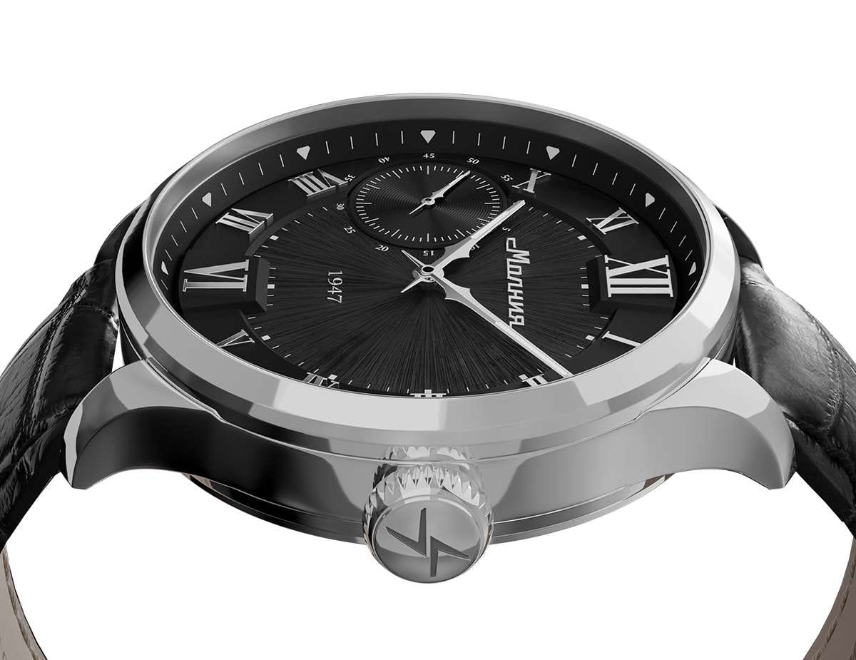 Мужские механические часы с ручным подзаводом — это аксессуар от легендарного бренда «МОЛНИЯ», созданный на Челябинском часовом заводе. Корпус диаметром 41 мм и толщиной 12 мм выполнен из нержавеющей стали 316L с зеркальной полировкой. БезельБезельВнешний ободок, закрепляющий стекло. В спортивных часах так называется поворотное кольцо с делениями на циферблате, выполняет роль таймера – замеряет отрезки времени на шкале. Неподвижный безель – элемент декора. Однонаправленно вращающийся безель на дайверских часах позволяет фиксировать моменты погружения и выныривания на поверхность. также выполнен из стали с зеркальной отделкой. Циферблат чёрного цвета оформлен римскими цифрами и стальными индексами. Малая секундная стрелка вынесена на позицию 9 часов. Циферблат защищён сапфировым стекломСапфировое стеклоПрочный и надёжный материал из кристалла сапфира синтетического происхождения, характеризующийся особой твёрдостью и устойчивостью к царапинам и повреждениям. толщиной 2,5 мм. Механизм — мануфактурный калибр 3603, собранный вручную, с запасом хода до 40 часов. Прозрачная задняя крышка позволяет наблюдать за работой механизма. Часы оснащены чёрным кожаным ремешком шириной 20 мм с раскладной застёжкойРаскладная застёжкаТакой тип застёжки используется только на браслетах из металла. Она никогда не раскрывается полностью, происходит разделение на 2 и более частей. Раскладывающая застёжка снизит вероятность потери часов к минимуму. и системой быстрой замены. Водонепроницаемость 100 м позволяет использовать часы для плавания и повседневного ношения. Идеальный выбор для тех, кто ценит российское качество и традиции.