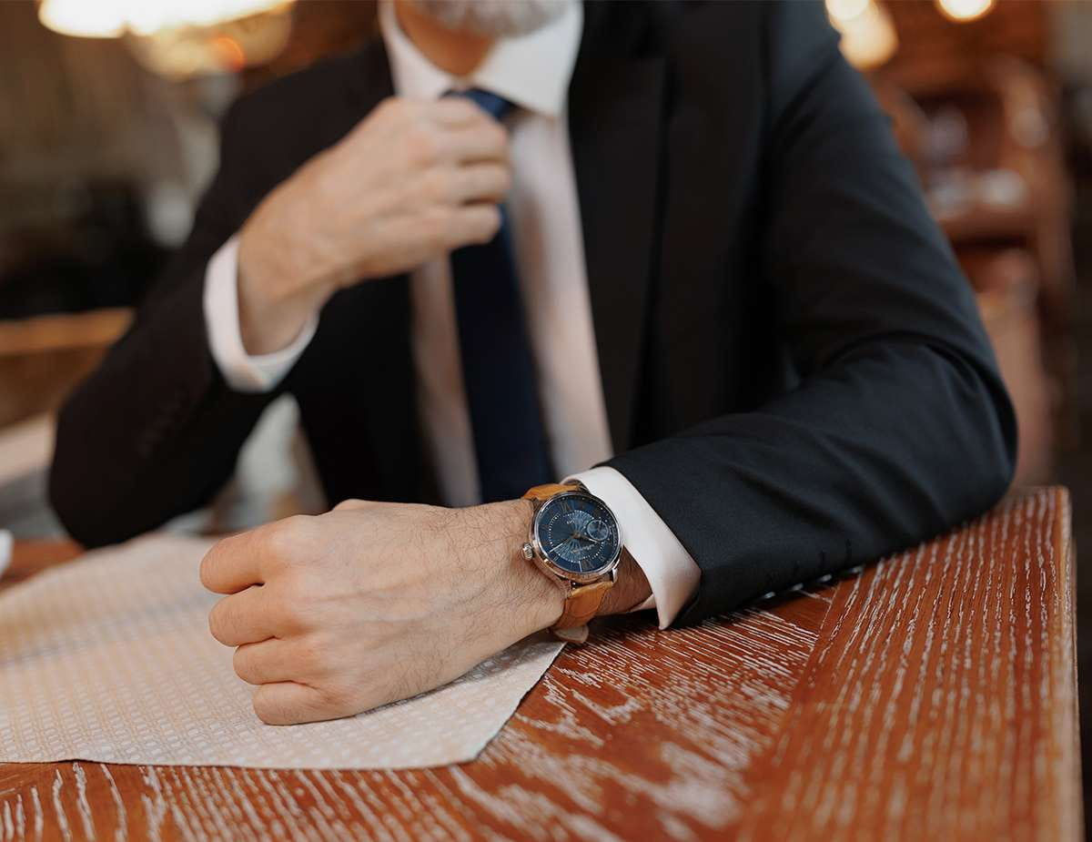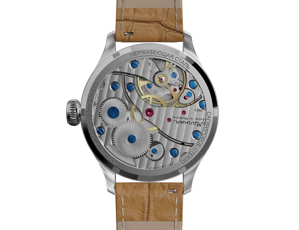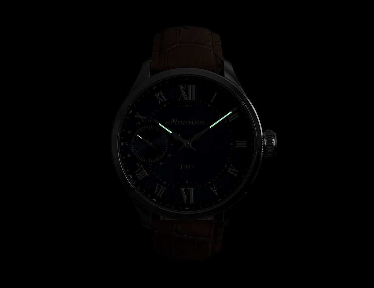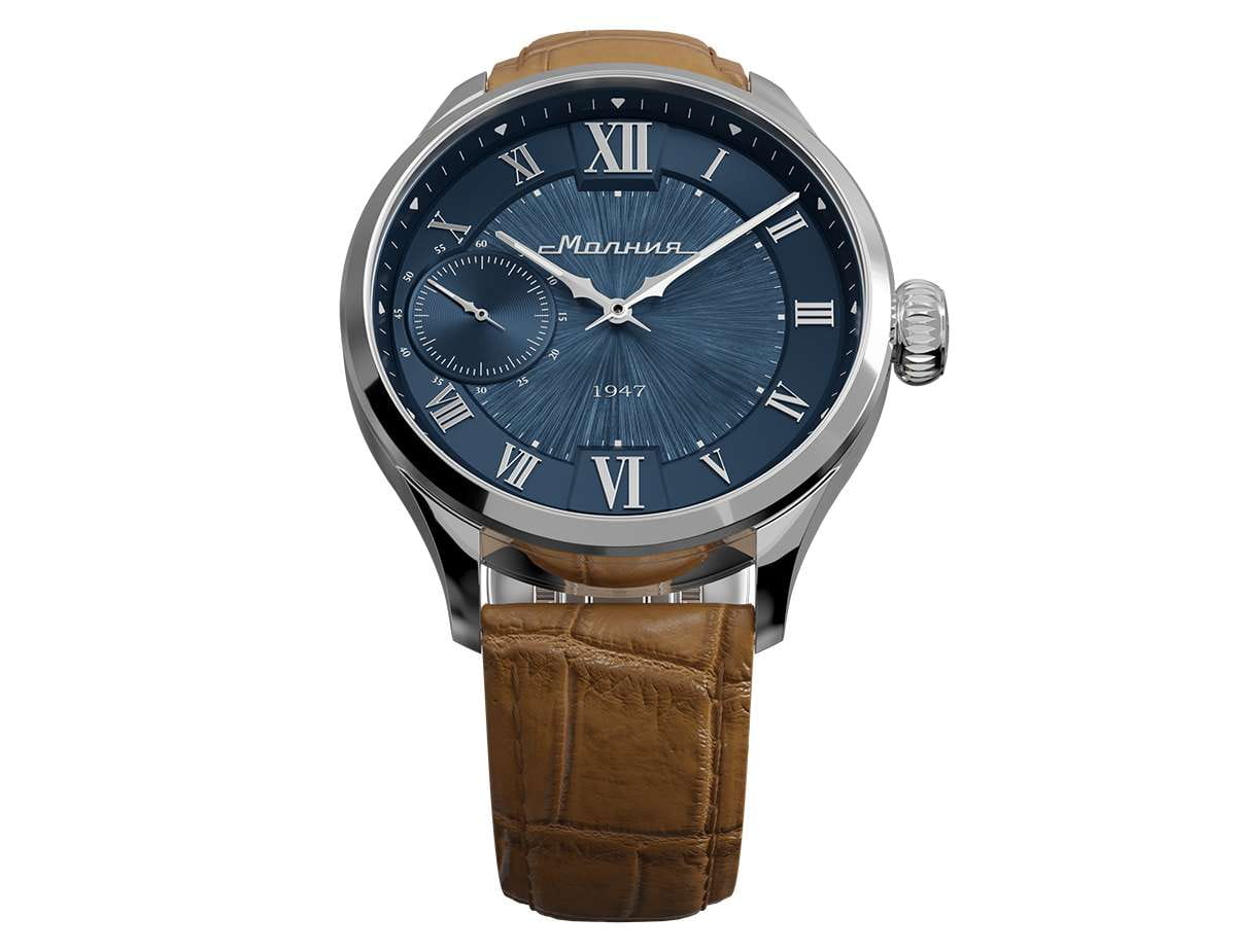 Мужские механические часы с ручным подзаводом — это аксессуар от легендарного бренда «МОЛНИЯ», созданный на Челябинском часовом заводе. Корпус диаметром 41 мм и толщиной 12 мм выполнен из нержавеющей стали 316L с зеркальной полировкой. БезельБезельВнешний ободок, закрепляющий стекло. В спортивных часах так называется поворотное кольцо с делениями на циферблате, выполняет роль таймера – замеряет отрезки времени на шкале. Неподвижный безель – элемент декора. Однонаправленно вращающийся безель на дайверских часах позволяет фиксировать моменты погружения и выныривания на поверхность. также выполнен из стали с зеркальной отделкой. Циферблат синего цвета оформлен римскими цифрами и стальными индексами. Малая секундная стрелка вынесена на позицию 9 часов. Циферблат защищён сапфировым стекломСапфировое стеклоПрочный и надёжный материал из кристалла сапфира синтетического происхождения, характеризующийся особой твёрдостью и устойчивостью к царапинам и повреждениям. толщиной 2,5 мм. Механизм — мануфактурный калибр 3603, собранный вручную, с запасом хода до 40 часов. Прозрачная задняя крышка позволяет наблюдать за работой механизма. Часы оснащены светло-коричневым кожаным ремешком шириной 20 мм с раскладной застёжкойРаскладная застёжкаТакой тип застёжки используется только на браслетах из металла. Она никогда не раскрывается полностью, происходит разделение на 2 и более частей. Раскладывающая застёжка снизит вероятность потери часов к минимуму. и системой быстрой замены. Водонепроницаемость 100 м позволяет использовать часы для плавания и повседневного ношения. Идеальный выбор для тех, кто ценит российское качество и традиции.