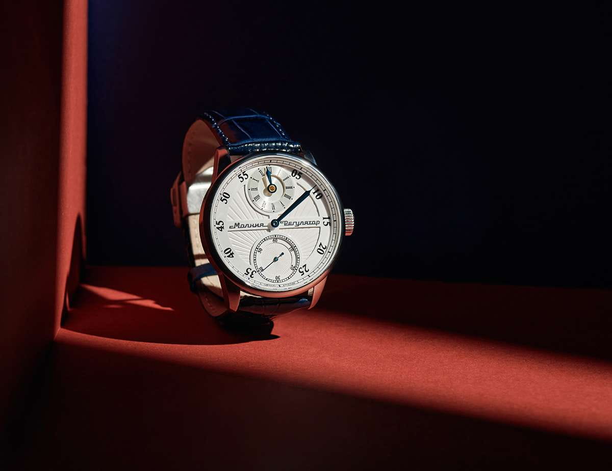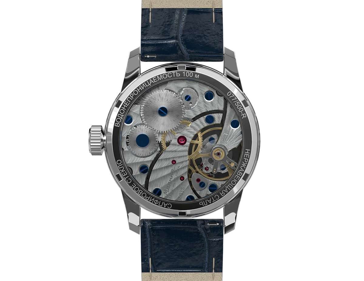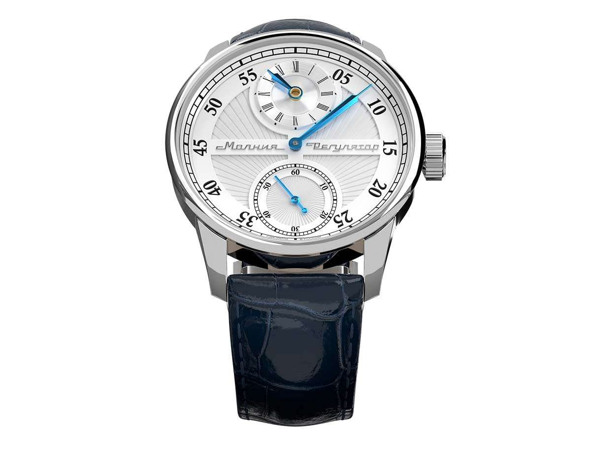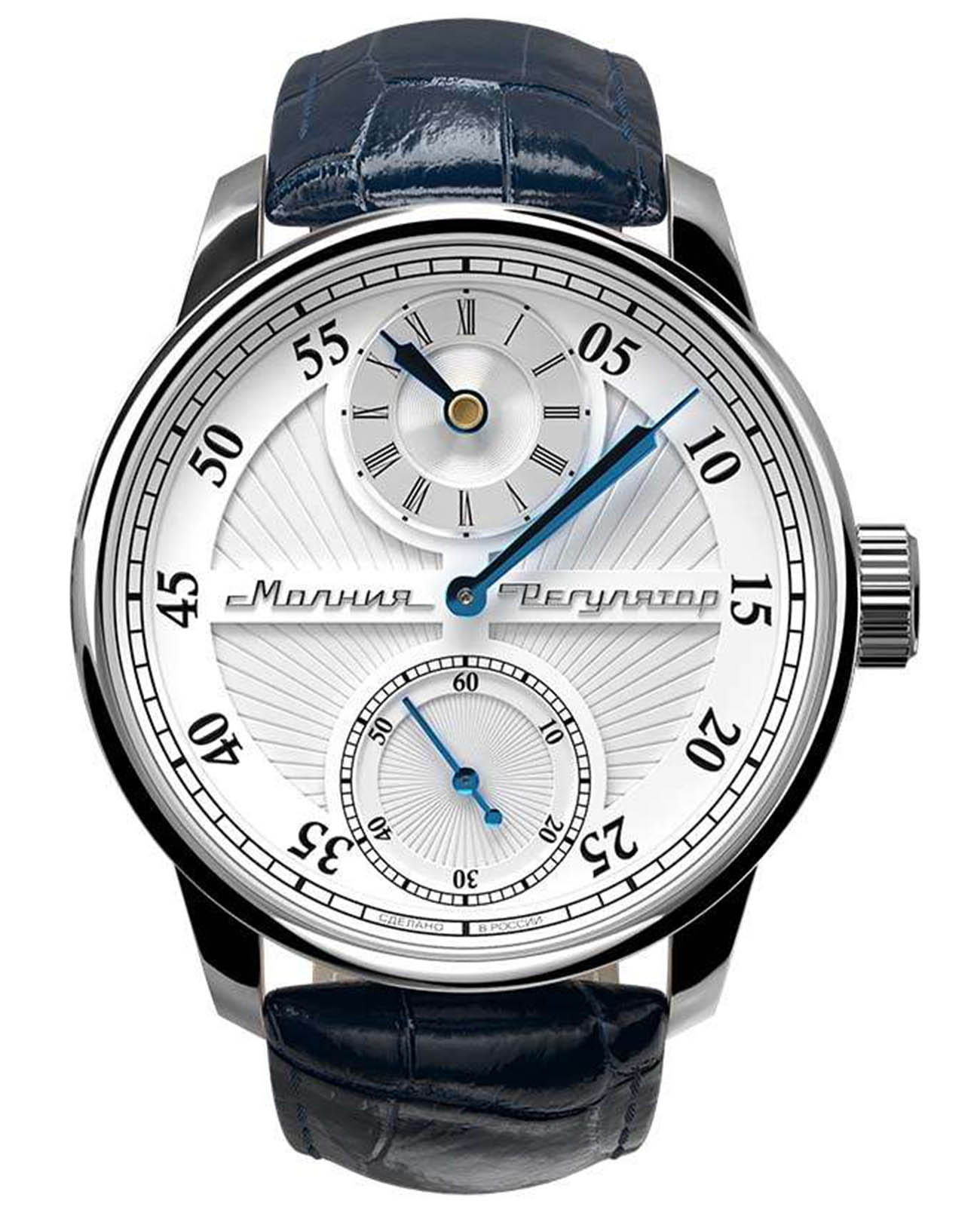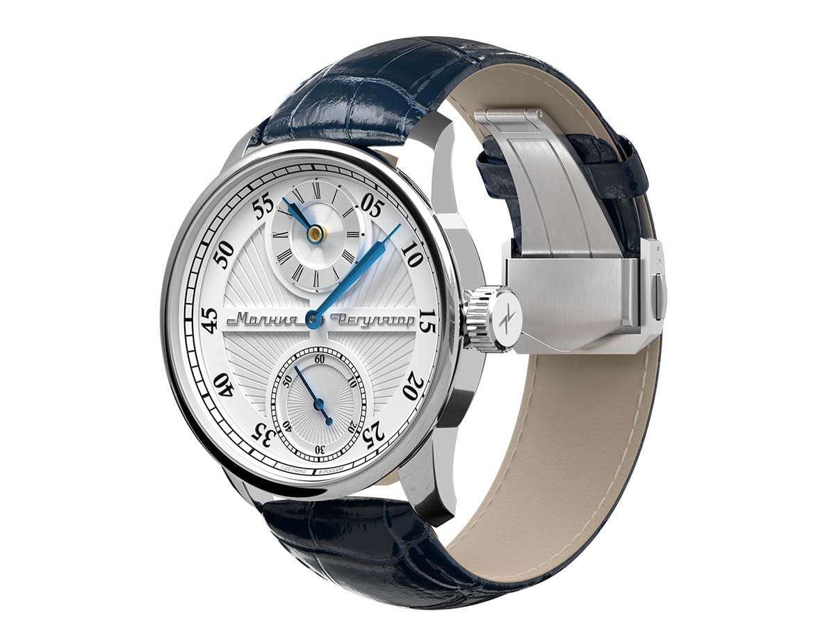 Мужские механические часы с ручным подзаводом — это аксессуар от легендарного бренда «МОЛНИЯ», созданный на Челябинском часовом заводе. Корпус диаметром 42 мм выполнен из нержавеющей стали. Циферблат оформлен индексами и стрелками. Малая секундная стрелка вынесена на отдельный субциферблат. Циферблат защищён сапфировым стекломСапфировое стеклоПрочный и надёжный материал из кристалла сапфира синтетического происхождения, характеризующийся особой твёрдостью и устойчивостью к царапинам и повреждениям.. Механизм — мануфактурный калибр 3603RS, полностью собранный вручную, с декорированными деталями, которые видны через прозрачную заднюю крышку. Часы оснащены кожаным ремешком синего цвета с раскладной застёжкойРаскладная застёжкаТакой тип застёжки используется только на браслетах из металла. Она никогда не раскрывается полностью, происходит разделение на 2 и более частей. Раскладывающая застёжка снизит вероятность потери часов к минимуму.. Водонепроницаемость 100 м позволяет использовать часы для плавания и повседневного ношения. Идеальный выбор для тех, кто ценит российское качество и традиции.