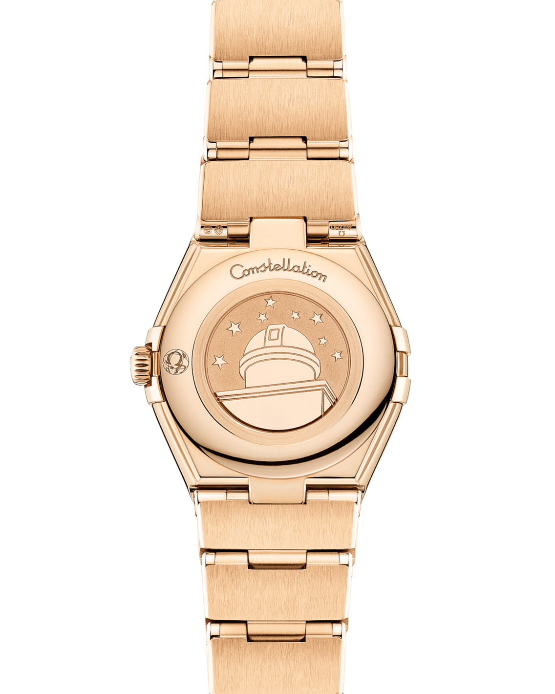 Moonshine™ гармонируют с бриллиантовыми метками в золотых оправах, мерцающими как далекие созвездия. Часы дополнены интегрированным браслетом с инновационной системой подгонки, а их лунной душой выступает калибр OMEGA 4061, скрытый за крышкой с рельефным медальоном обсерватории - символом вечного стремления к космической точности.