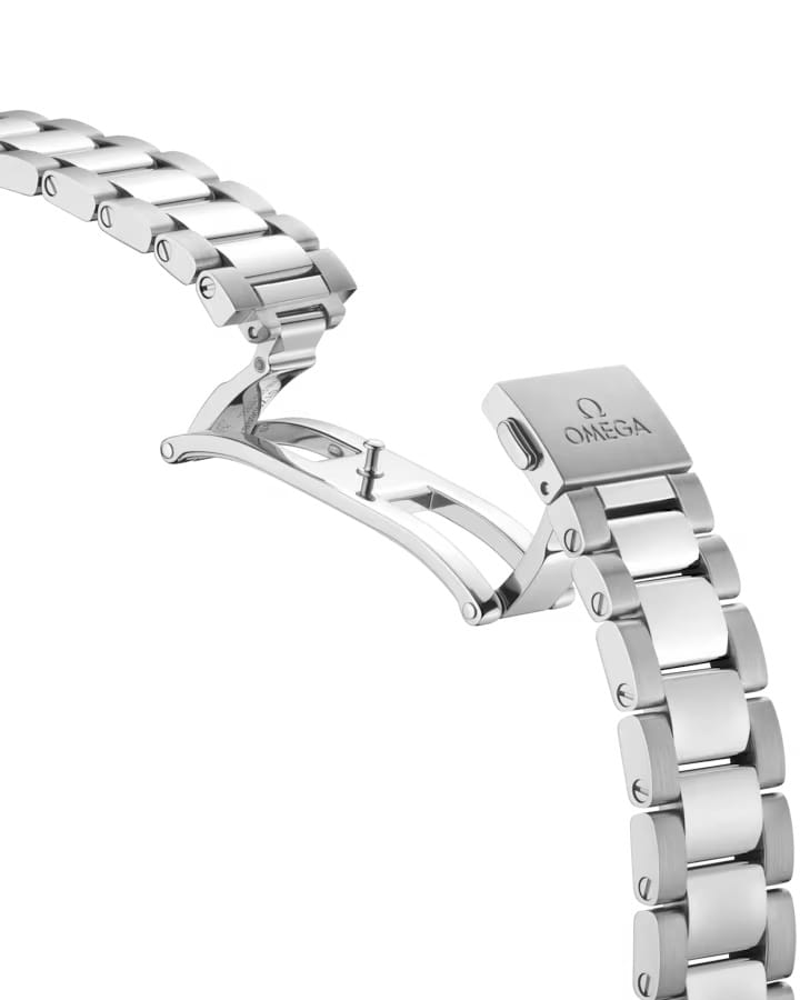 Omega Seamaster Aqua Terra выполнены в симметричном корпусе из нержавеющей стали с завинчивающейся задней крышкой, украшенной волновым узором. Циферблат дополнен окошком даты на 6 часах и 11 бриллиантами, установленными в родиевые держатели — деталь, подчёркивающая женственность и роскошь модели. Циферблат изготовлен из перламутрового материала с переливающейся текстурой, а стрелки и метки выполнены из белого золота. Калибр Omega 8800 сертифицирован как Master Chronometer — гарантия высочайшей точности и устойчивости к магнитным полям. Запас хода составляет 55 часов. Защиту циферблата обеспечивает сапфировое стеклоСапфировое стеклоПрочный и надёжный материал из кристалла сапфира синтетического происхождения, характеризующийся особой твёрдостью и устойчивостью к царапинам и повреждениям. с антибликовым покрытиемАнтибликовое покрытиеСлой оксида металла в 0,13-0,3 микрон, благодаря которому стекло часов не бликует и не отражает свет. Антибликовое покрытие уменьшает отражение света в 10 раз, обеспечивая отличную читаемость показателей циферблата. с обеих сторон. Водозащита позволяет использовать часы в воде без риска повреждения. Часы установлены на интегрированный стальной браслет. Это сочетание премиального качества, технологичности и классического дизайна.