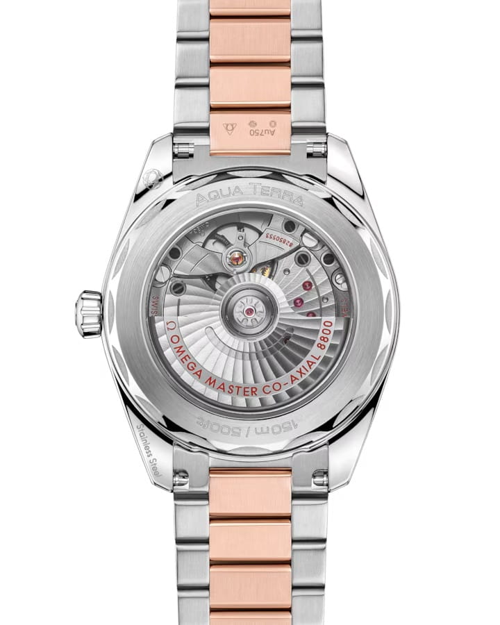 Omega Seamaster Aqua Terra выполнены в симметричном корпусе из нержавеющей стали и 18K Sedna™ золота с завинчивающейся задней крышкой, украшенной волновым узором. Циферблат дополнен окошком даты на 6 часах. Стрелки и метки оснащены люминесцентным покрытиемЛюминесцентное покрытиеПозволяет считывать показания времени в темноте. Производители наносят на стрелки, часовые индексы, безель или поверхность циферблата светонакопительный состав, дающий холодное свечение. Super-LumiNova для лучшей читаемости в темноте. Калибр Omega 8800 сертифицирован как Master Chronometer — гарантия высочайшей точности и устойчивости к магнитным полям. Запас хода составляет 55 часов. Защиту циферблата обеспечивает сапфировое стеклоСапфировое стеклоПрочный и надёжный материал из кристалла сапфира синтетического происхождения, характеризующийся особой твёрдостью и устойчивостью к царапинам и повреждениям. с антибликовым покрытиемАнтибликовое покрытиеСлой оксида металла в 0,13-0,3 микрон, благодаря которому стекло часов не бликует и не отражает свет. Антибликовое покрытие уменьшает отражение света в 10 раз, обеспечивая отличную читаемость показателей циферблата.. Водозащита позволяет использовать часы в воде без риска повреждения. Часы установлены на комбинированный браслет из 18K Sedna™ золота и нержавеющей стали с застёжка «бабочка» с кнопкамиЗастёжка "бабочка"Такой вид застёжки дополняется предохранителями, помогающими избежать случайного раскрытия браслета. Обладают изящным исполнением. . Это сочетание премиального качества, технологичности и классического дизайна.
