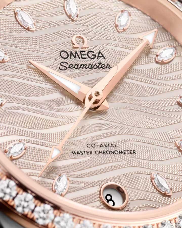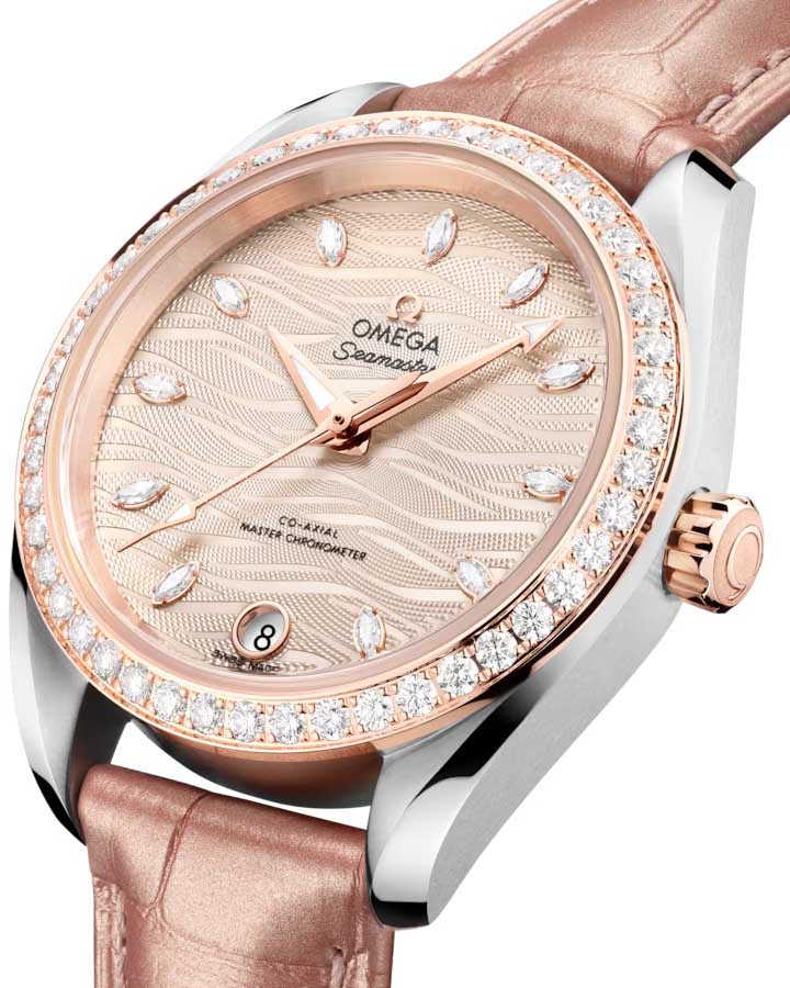 Часы Omega Seamaster Aqua Terra выполнены в симметричном корпусе из нержавеющей стали и 18K Sedna™ золота с завинчивающейся задней крышкой, украшенной волновым узором. Модель дополнена полированным безелем с бриллиантами, что добавляет роскошный акцент. Циферблат золотистого цвета оформлен с использованием волнообразного рисунка и имеет окошко даты на 6 часах. Стрелки выполнены из 18K Sedna™ золота с алмазной полировкой. Часовые метки — 11 бриллиантов в маркизной оправе, что подчёркивает элегантность модели. Калибр Omega 8800 сертифицирован как Master Chronometer — гарантия высочайшей точности и устойчивости к магнитным полям. Запас хода составляет 55 часов. Защиту циферблата обеспечивает сапфировое стеклоСапфировое стеклоПрочный и надёжный материал из кристалла сапфира синтетического происхождения, характеризующийся особой твёрдостью и устойчивостью к царапинам и повреждениям. с антибликовым покрытиемАнтибликовое покрытиеСлой оксида металла в 0,13-0,3 микрон, благодаря которому стекло часов не бликует и не отражает свет. Антибликовое покрытие уменьшает отражение света в 10 раз, обеспечивая отличную читаемость показателей циферблата. с обеих сторон. Водозащита позволяет использовать часы в воде без риска повреждения. Часы установлены на кожаный ремешок бежевого цвета. Это сочетание премиального качества, технологичности и классического дизайна.