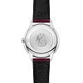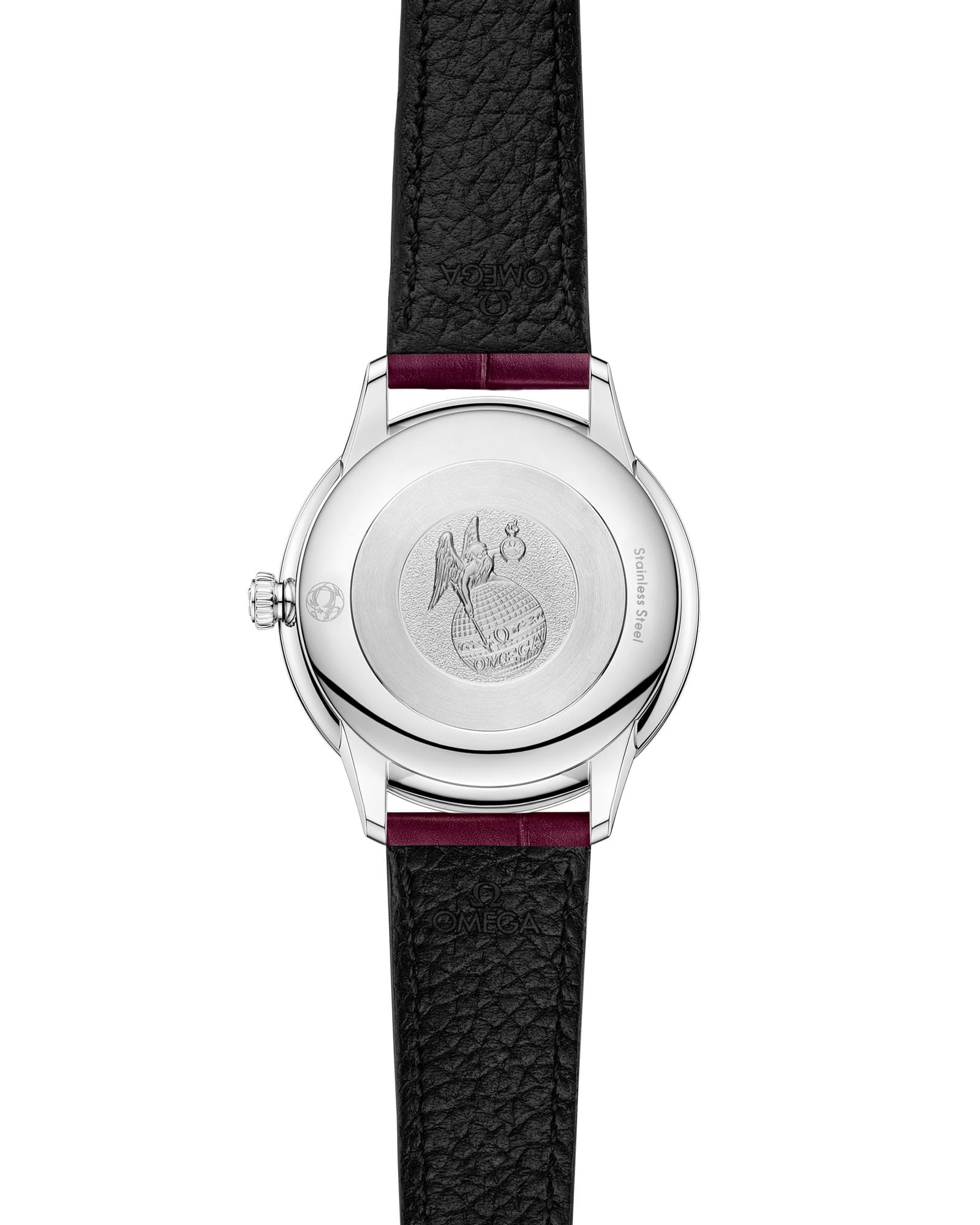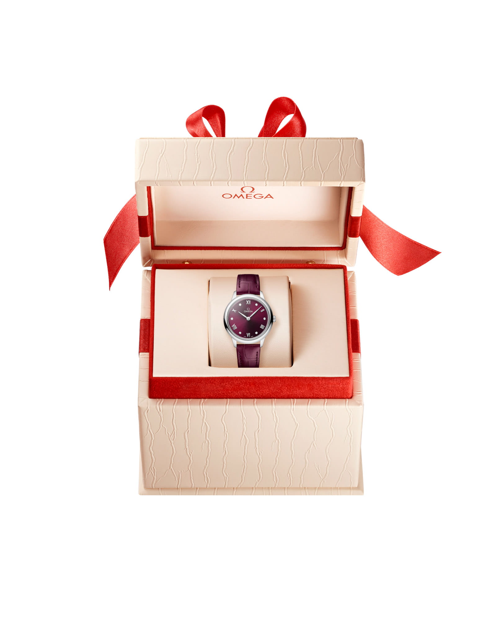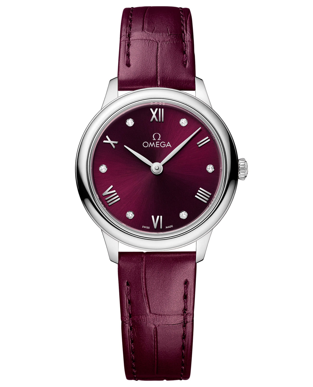 Коллекция OMEGA De Ville Prestige, сохраняющая свою актуальность с 1994 года, предстает в третьем поколении. Эти часы продолжают быть символом классического дизайна и утонченной элегантности. Модели, которые привлекают внимание разнообразием узоров, отделок и цветов, идеально подходят для людей с различными стилями жизни и характерами. Часы в корпусе диаметром 27,5 мм из нержавеющей стали имеют циферблат с PVD-покрытиемPVDУльтратонкое покрытие наносится в технике вакуумного напыления, сочетает в себе нитрид титана особой прочности со слоем золота или оксида хрома. Несёт в себе декоративную или защитную функцию. фиолетово-бордового цвета и радиальным сатинированием. На циферблате расположены стрелки с родиевым покрытием, а также чередующиеся римские цифры и метки из бриллиантов. Изделие с лаконичным дизайном дополнено задней крышкой, украшенной рельефным медальоном с изображением бога времени Хроноса. Часы представлены с переливающимся кожаным ремешком бордового цвета. Модель оснащена кварцевым механизмом OMEGA 4061, который обеспечивает срок службы элемента питания не менее 48 месяцев.