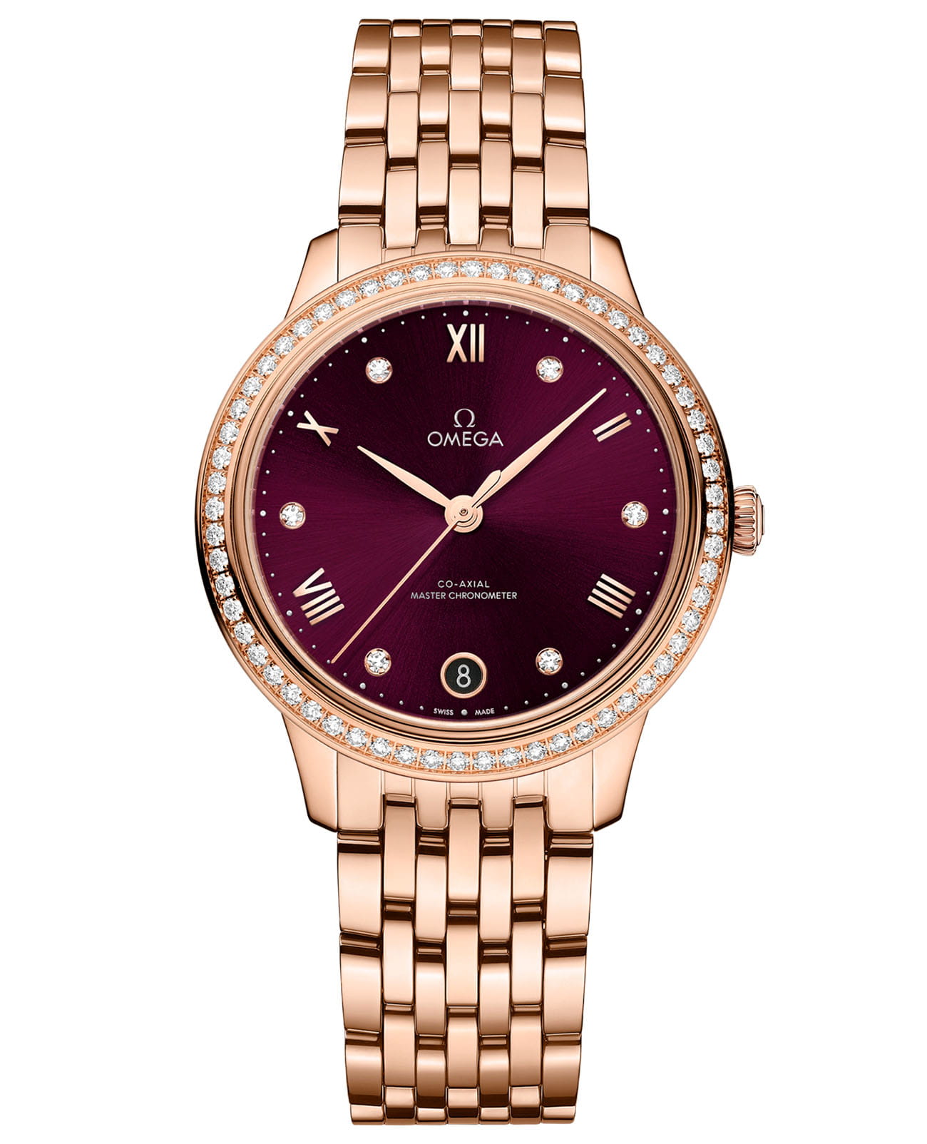 имеют инкрустированный бриллиантами безельБезельВнешний ободок, закрепляющий стекло. В спортивных часах так называется поворотное кольцо с делениями на циферблате, выполняет роль таймера – замеряет отрезки времени на шкале. Неподвижный безель – элемент декора. Однонаправленно вращающийся безель на дайверских часах позволяет фиксировать моменты погружения и выныривания на поверхность. и циферблат с PVD-покрытиемPVDУльтратонкое покрытие наносится в технике вакуумного напыления, сочетает в себе нитрид титана особой прочности со слоем золота или оксида хрома. Несёт в себе декоративную или защитную функцию. фиолетово-бордового цвета и радиальным сатинированием. На циферблате расположены стрелки с PVD-покрытиемPVDУльтратонкое покрытие наносится в технике вакуумного напыления, сочетает в себе нитрид титана особой прочности со слоем золота или оксида хрома. Несёт в себе декоративную или защитную функцию. цвета золота Sedna™18-каратное золотоОбозначение по каратной системе пробирования, оно показывает, сколько драгоценного металла содержится в изделии. 18 карат - в составе 75% чистого золота, соответствует 750 пробе.