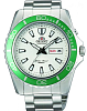 Наручные часы оснащены японским автоматическим механизмом Orient 46943, отличающимся запасом хода на 40 часов. Привлекательно смотрится зелёный вращающийся безельБезельВнешний ободок, закрепляющий стекло. В спортивных часах так называется поворотное кольцо с делениями на циферблате, выполняет роль таймера – замеряет отрезки времени на шкале. Неподвижный безель – элемент декора. Однонаправленно вращающийся безель на дайверских часах позволяет фиксировать моменты погружения и выныривания на поверхность.. Среди особенностей модели выделяют завинчивающуюся заднюю крышку и заводную головку, люминесцентную подсветкуЛюминесцентное покрытиеПозволяет считывать показания времени в темноте. Производители наносят на стрелки, часовые индексы, безель или поверхность циферблата светонакопительный состав, дающий холодное свечение., отображение даты и дня недели, повышенную водостойкость 200 метров.