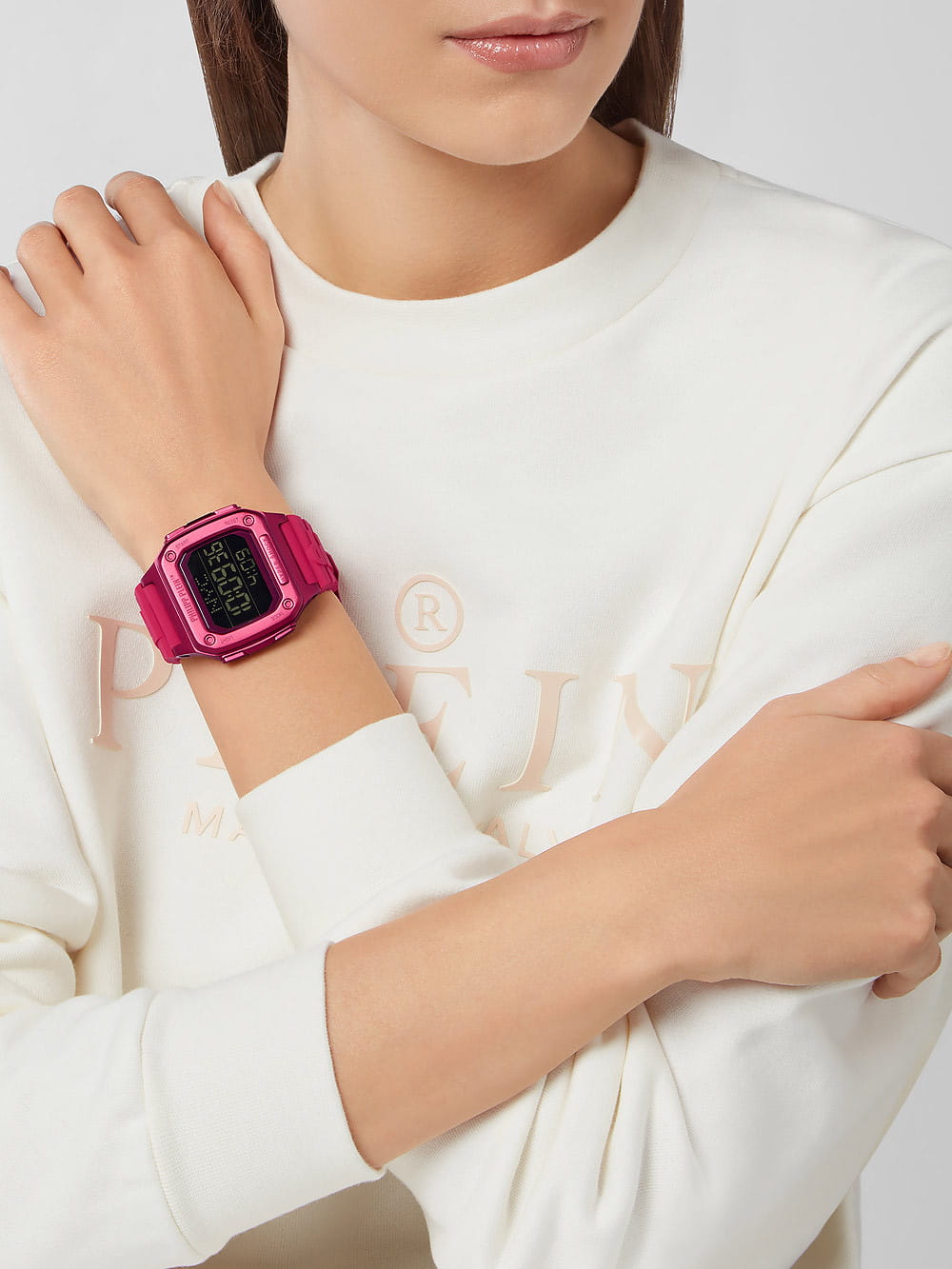 Электронные унисекс часы-хронографХронографФункция позволяет измерять отрезки времени с особой точностью: часы, минуты, секунды. Верным признаком хронографа является наличие на циферблате 3 дополнительных окошек-счётчиков. Philipp Plein Hyper Shock PWHAA0121, электронный механизм с высокой точностью. Класс водозащиты: 50 метров, позволит защитить корпус от случайных брызг или капель дождя. Прямоугольный корпус выполнен из нержавеющей стали с IP-покрытиемIP-покрытиеМетод ионного напыления. Демонстрирует повышенную устойчивость к истиранию, окислению и химическим веществам. Под воздействием высокого давления и температуры около 1500°C молекулы металла надёжно соединяются с частицами корпуса часов. розового цвета. Силиконовый ремешок шириной 22 мм, со стандартной застежкой.