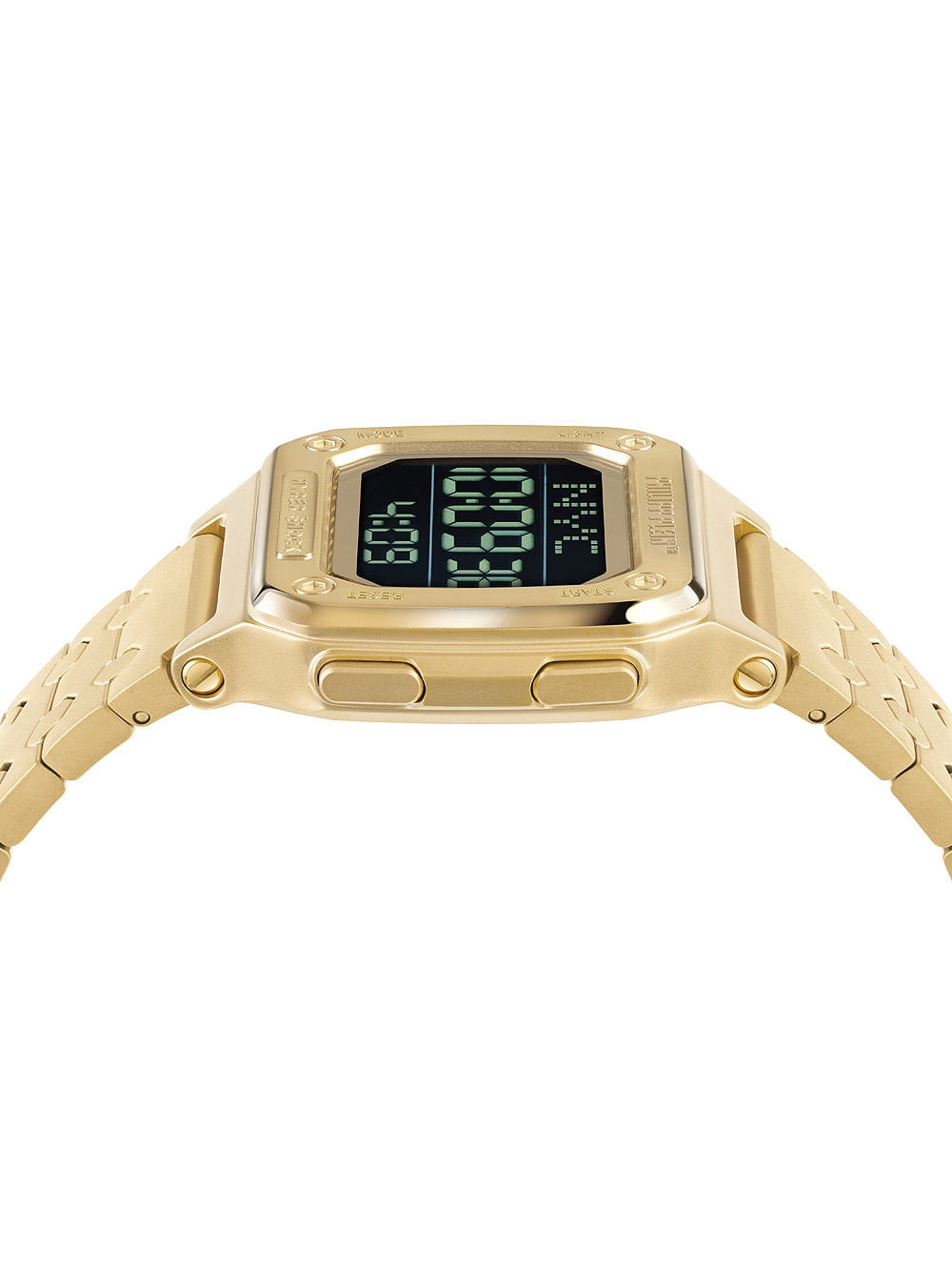 Электронные унисекс часы-хронографХронографФункция позволяет измерять отрезки времени с особой точностью: часы, минуты, секунды. Верным признаком хронографа является наличие на циферблате 3 дополнительных окошек-счётчиков. Philipp Plein Hyper Shock PWHAA0621, электронный механизм с высокой точностью. Класс водозащиты: 50 метров, позволит защитить корпус от случайных брызг или капель дождя. Прямоугольный корпус выполнен из нержавеющей стали с IP-покрытиемIP-покрытиеМетод ионного напыления. Демонстрирует повышенную устойчивость к истиранию, окислению и химическим веществам. Под воздействием высокого давления и температуры около 1500°C молекулы металла надёжно соединяются с частицами корпуса часов. золотистого цвета. Браслет из нержавеющей стали шириной 22 мм, застёжка «бабочка» с кнопкамиЗастёжка "бабочка"Такой вид застёжки дополняется предохранителями, помогающими избежать случайного раскрытия браслета. Обладают изящным исполнением. .