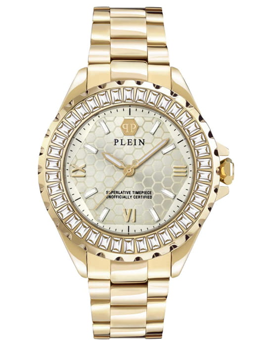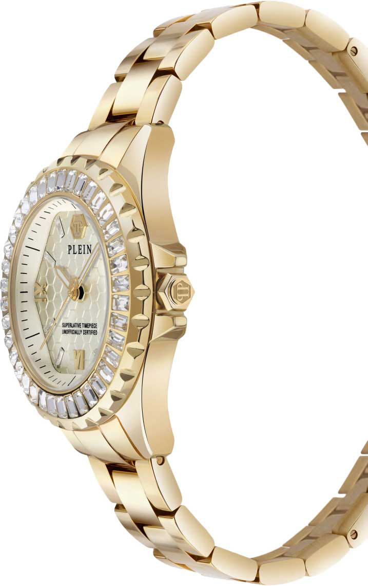 Женские часы Philipp Plein PWPOA0624 с надежным кварцевым механизмом. Корпус часов изготовлен из стали с IP-покрытиемIP-покрытиеМетод ионного напыления. Демонстрирует повышенную устойчивость к истиранию, окислению и химическим веществам. Под воздействием высокого давления и температуры около 1500°C молекулы металла надёжно соединяются с частицами корпуса часов.. Минеральное стеклоМинеральное стеклоМинеральное стекло представляет собой искусственно выращенный минерал кварца. Такое стекло отличается особой устойчивостью к повреждениям и царапинам. Уступает по некоторым качествам сапфировому стеклу. устойчивое к мелким механическим повреждениям. Влагозащита: 50 метров, позволит плавать, нырять и заниматься другими водными видами спорта. Стрелки и метки с люминесцентным покрытиемЛюминесцентное покрытиеПозволяет считывать показания времени в темноте. Производители наносят на стрелки, часовые индексы, безель или поверхность циферблата светонакопительный состав, дающий холодное свечение..