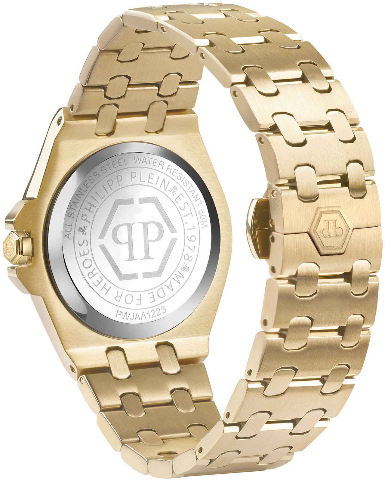 Женкие кварцевые часы Philipp Plein Extreme PWJAA1223. Корпус и браслет часов изготовлены из нержавеющей стали с IP-покрытиемIP-покрытиеМетод ионного напыления. Демонстрирует повышенную устойчивость к истиранию, окислению и химическим веществам. Под воздействием высокого давления и температуры около 1500°C молекулы металла надёжно соединяются с частицами корпуса часов. . Минеральное стеклоМинеральное стеклоМинеральное стекло представляет собой искусственно выращенный минерал кварца. Такое стекло отличается особой устойчивостью к повреждениям и царапинам. Уступает по некоторым качествам сапфировому стеклу. устойчивое к мелким механическим повреждениям. Стальной браслет на застёжке-бабочке с кнопкамиЗастёжка "бабочка"Такой вид застёжки дополняется предохранителями, помогающими избежать случайного раскрытия браслета. Обладают изящным исполнением. . Влагозащита: 50 метров, позволит защитить корпус от случайных брызг или капель дождя. Стрелки и метки с люминесцентным покрытиемЛюминесцентное покрытиеПозволяет считывать показания времени в темноте. Производители наносят на стрелки, часовые индексы, безель или поверхность циферблата светонакопительный состав, дающий холодное свечение.. Практичный ремешок из силикона на стандартной застёжке. БезельБезельВнешний ободок, закрепляющий стекло. В спортивных часах так называется поворотное кольцо с делениями на циферблате, выполняет роль таймера – замеряет отрезки времени на шкале. Неподвижный безель – элемент декора. Однонаправленно вращающийся безель на дайверских часах позволяет фиксировать моменты погружения и выныривания на поверхность. и браслет инкрустированы цветными кристаллами Preciosa.