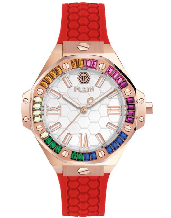 Philipp Plein Plein Lady Royal PWBDA0524 — стильные женские часы, сочетающие элегантный дизайн и функциональность. Корпус диаметром 39 мм выполнен из нержавеющей стали с розовым PVD-покрытиемPVDУльтратонкое покрытие наносится в технике вакуумного напыления, сочетает в себе нитрид титана особой прочности со слоем золота или оксида хрома. Несёт в себе декоративную или защитную функцию., что придаёт часам роскошный вид. Минеральное стеклоМинеральное стеклоМинеральное стекло представляет собой искусственно выращенный минерал кварца. Такое стекло отличается особой устойчивостью к повреждениям и царапинам. Уступает по некоторым качествам сапфировому стеклу. защищает циферблат от царапин, сохраняя его безупречный внешний вид. Циферблат инкрустирован кристаллами. Серебристый циферблат с шестиугольной текстурой подчёркивает фирменный стиль бренда. Часы оснащены кварцевым механизмом, который гарантирует точность хода. Водозащита до 5 ATM (50 метров) делает часы подходящими для повседневного использования. Ремешок из красного силикона обеспечивает комфортное ношение и надёжную фиксацию благодаря классической застёжке. Ширина ремешка 16 мм гармонично дополняет корпус, завершая стильный и современный образ.