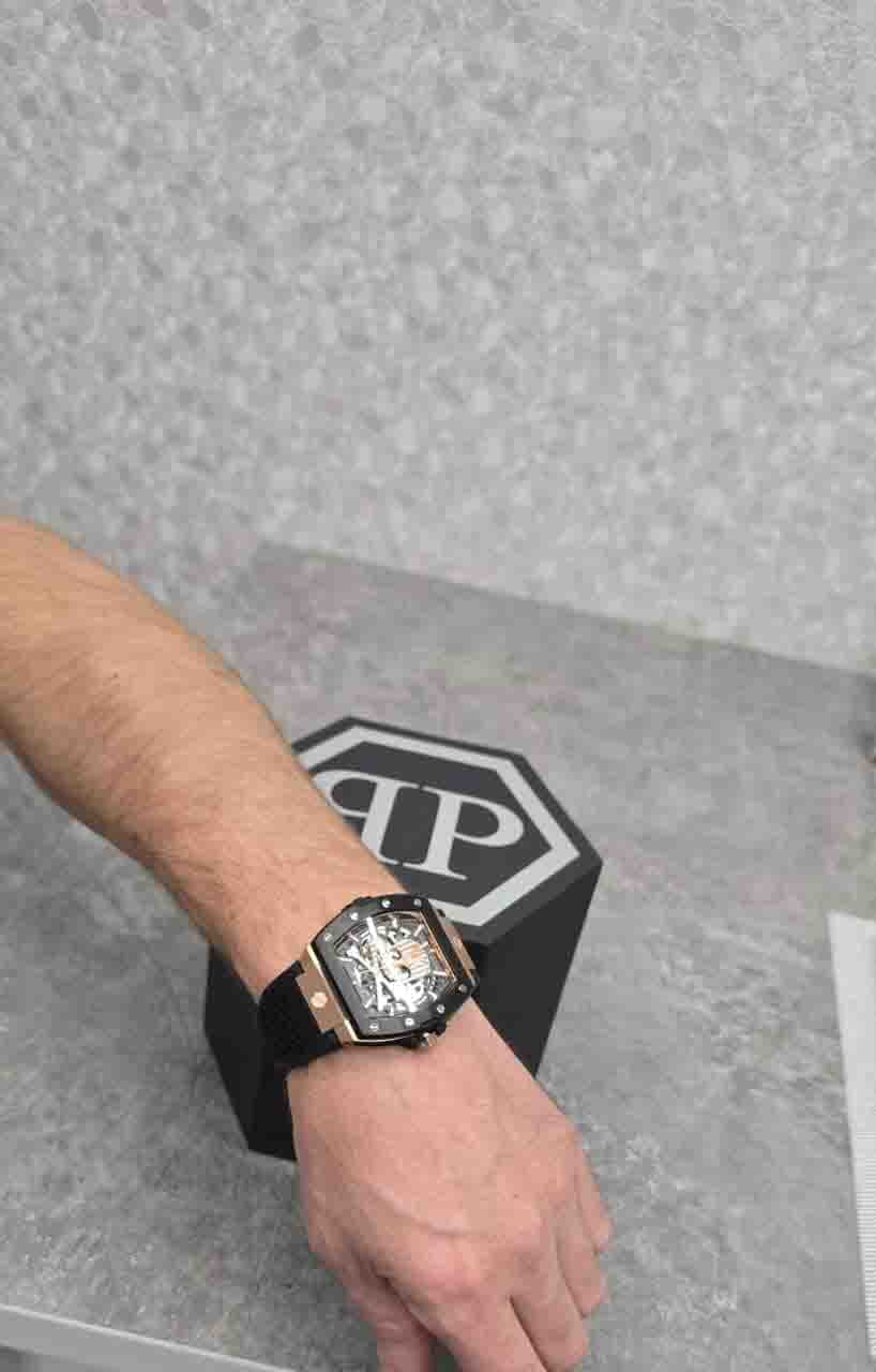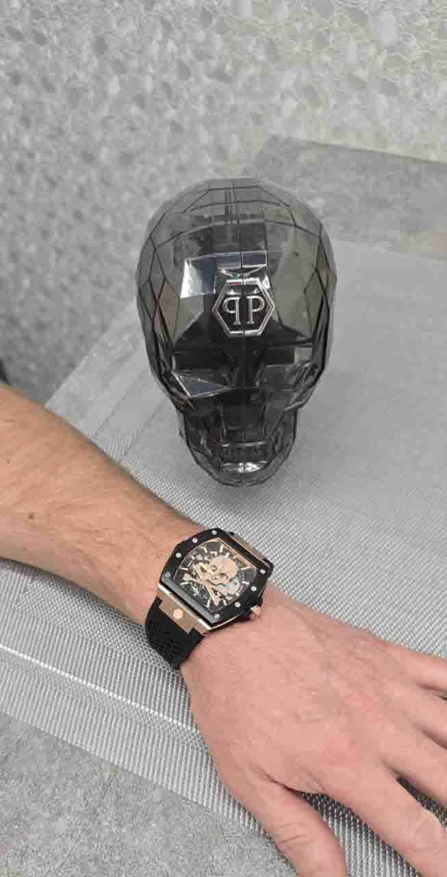 Philipp Plein The $keleton 2.0 PWJFA0225 - это дерзкие и бескомпромиссные часы, воплощающие бунтарский дух бренда. Их отличает узнаваемый мотив черепа, ставший визитной карточкой Philipp Plein, искусно интегрированный в дизайн циферблата. Скелетонизированные мужские механические часы с автоподзаводом. Бочкообразный стальной корпус диаметром 44 мм с PVD-покрытиемPVDУльтратонкое покрытие наносится в технике вакуумного напыления, сочетает в себе нитрид титана особой прочности со слоем золота или оксида хрома. Несёт в себе декоративную или защитную функцию.. Силиконовый ремешок на стандартной застёжке обеспечивает надёжную фиксацию и комфортное ношение. Люминесцентное покрытиеЛюминесцентное покрытиеПозволяет считывать показания времени в темноте. Производители наносят на стрелки, часовые индексы, безель или поверхность циферблата светонакопительный состав, дающий холодное свечение. стрелок и меток позволит следить за временем даже в полной темноте. Метки в виде точек. Минеральное стеклоМинеральное стеклоМинеральное стекло представляет собой искусственно выращенный минерал кварца. Такое стекло отличается особой устойчивостью к повреждениям и царапинам. Уступает по некоторым качествам сапфировому стеклу. защищает циферблат от царапин. Граненая заводная головка. Влагозащита: 50 метров, позволит защитить корпус от случайных брызг или капель дождя. Идеальный аксессуар для тех, кто ценит индивидуальность и не боится выделяться из толпы.