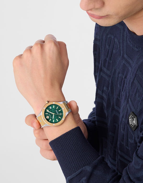 Philipp Plein Plein Underdog PWUFA0525 - это дерзкие и бескомпромиссные часы, воплощающие бунтарский дух бренда. Диаметр корпуса из прочной нержавеющей стали равен 44 мм. Стальной браслет на застёжке-бабочке с кнопкамиЗастёжка "бабочка"Такой вид застёжки дополняется предохранителями, помогающими избежать случайного раскрытия браслета. Обладают изящным исполнением. обеспечивает надёжную фиксацию и комфортное ношение. Метки в виде штрихов. Минеральное стеклоМинеральное стеклоМинеральное стекло представляет собой искусственно выращенный минерал кварца. Такое стекло отличается особой устойчивостью к повреждениям и царапинам. Уступает по некоторым качествам сапфировому стеклу. защищает циферблат от царапин. Люминесцентное покрытиеЛюминесцентное покрытиеПозволяет считывать показания времени в темноте. Производители наносят на стрелки, часовые индексы, безель или поверхность циферблата светонакопительный состав, дающий холодное свечение. стрелок и меток позволит следить за временем даже в полной темноте. БезельБезельВнешний ободок, закрепляющий стекло. В спортивных часах так называется поворотное кольцо с делениями на циферблате, выполняет роль таймера – замеряет отрезки времени на шкале. Неподвижный безель – элемент декора. Однонаправленно вращающийся безель на дайверских часах позволяет фиксировать моменты погружения и выныривания на поверхность. с PVD-покрытиемPVDУльтратонкое покрытие наносится в технике вакуумного напыления, сочетает в себе нитрид титана особой прочности со слоем золота или оксида хрома. Несёт в себе декоративную или защитную функцию.. Граненая заводная головка. Влагозащита: 50 метров, позволит защитить корпус от случайных брызг или капель дождя. Идеальный аксессуар для тех, кто ценит индивидуальность и не боится выделяться из толпы.