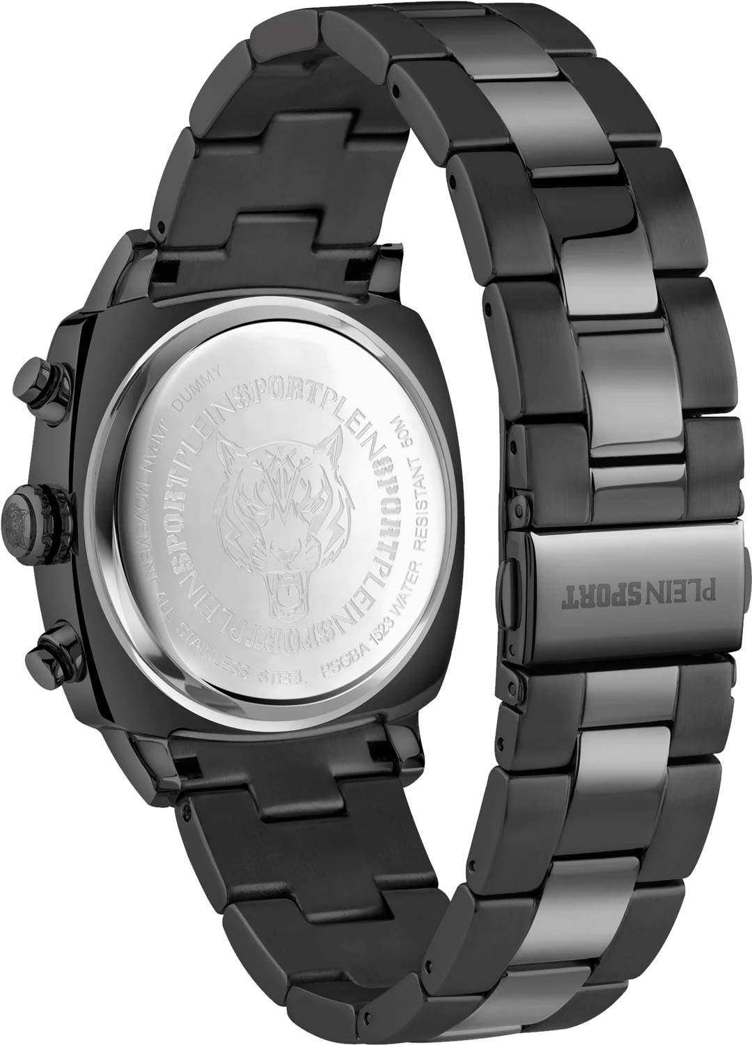 Немецкие мужские кварцевые часы-хронографХронографФункция позволяет измерять отрезки времени с особой точностью: часы, минуты, секунды. Верным признаком хронографа является наличие на циферблате 3 дополнительных окошек-счётчиков. с секундомеромСекундомерСекундоме́р — прибор, способный измерять интервалы времени с точностью до долей секунды. Plein Sport Wildcat PSGBA1523, кварцевый механизм с высокой точностью. Класс водозащиты: 50 метров, позволит защитить корпус от случайных брызг или капель дождя. Корпус часов изготовлен из стали с IP-покрытиемIP-покрытиеМетод ионного напыления. Демонстрирует повышенную устойчивость к истиранию, окислению и химическим веществам. Под воздействием высокого давления и температуры около 1500°C молекулы металла надёжно соединяются с частицами корпуса часов.. Стрелки и метки с люминесцентным покрытиемЛюминесцентное покрытиеПозволяет считывать показания времени в темноте. Производители наносят на стрелки, часовые индексы, безель или поверхность циферблата светонакопительный состав, дающий холодное свечение.. Стальной браслет на раскладной застёжкеРаскладная застёжкаТакой тип застёжки используется только на браслетах из металла. Она никогда не раскрывается полностью, происходит разделение на 2 и более частей. Раскладывающая застёжка снизит вероятность потери часов к минимуму. с IP-покрытиемIP-покрытиеМетод ионного напыления. Демонстрирует повышенную устойчивость к истиранию, окислению и химическим веществам. Под воздействием высокого давления и температуры около 1500°C молекулы металла надёжно соединяются с частицами корпуса часов.. Окошко даты находится в положении между 4 и 5 часов.