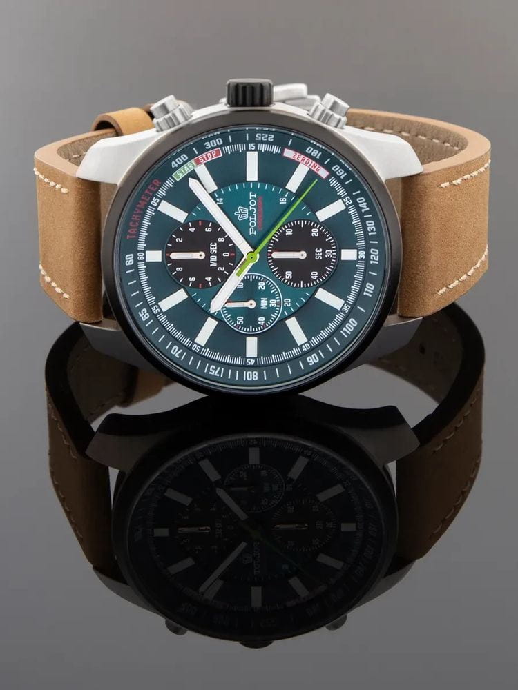 Poljot VD55.291236 — выразительные мужские часы с ярким спортивным акцентом, созданные для тех, кто ценит функциональность и характерный дизайн. Корпус из нержавеющей стали подчёркивает мощь и надёжность модели, а циферблат с контрастными счётчиками хронографаХронографФункция позволяет измерять отрезки времени с особой точностью: часы, минуты, секунды. Верным признаком хронографа является наличие на циферблате 3 дополнительных окошек-счётчиков. придаёт образу динамику и энергичность. БезельБезельВнешний ободок, закрепляющий стекло. В спортивных часах так называется поворотное кольцо с делениями на циферблате, выполняет роль таймера – замеряет отрезки времени на шкале. Неподвижный безель – элемент декора. Однонаправленно вращающийся безель на дайверских часах позволяет фиксировать моменты погружения и выныривания на поверхность. с PVD-покрытиемPVDУльтратонкое покрытие наносится в технике вакуумного напыления, сочетает в себе нитрид титана особой прочности со слоем золота или оксида хрома. Несёт в себе декоративную или защитную функцию.. Механизм SEIKO VD55 (Япония) обеспечивает точную работу секундомера и надёжность в ежедневном использовании. Широкие стрелки и метки с люминесцентным покрытиемЛюминесцентное покрытиеПозволяет считывать показания времени в темноте. Производители наносят на стрелки, часовые индексы, безель или поверхность циферблата светонакопительный состав, дающий холодное свечение. гарантируют превосходную читаемость в любое время суток. Прочное минеральное стеклоМинеральное стеклоМинеральное стекло представляет собой искусственно выращенный минерал кварца. Такое стекло отличается особой устойчивостью к повреждениям и царапинам. Уступает по некоторым качествам сапфировому стеклу. защищает циферблат, а водозащита до 5 ATM делает часы устойчивыми к влаге. Ремешок из натуральной кожи с контрастной строчкой завершает образ, обеспечивая комфорт и элегантность. Poljot — это стиль и точность, объединённые в спортивной форме с фирменным русским характером.