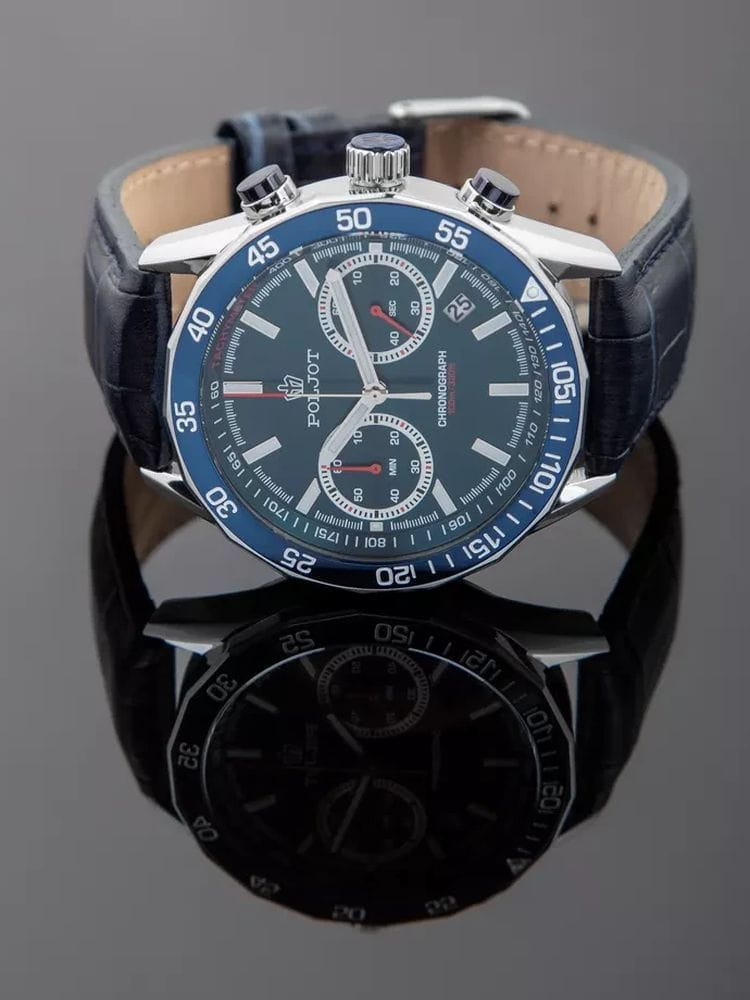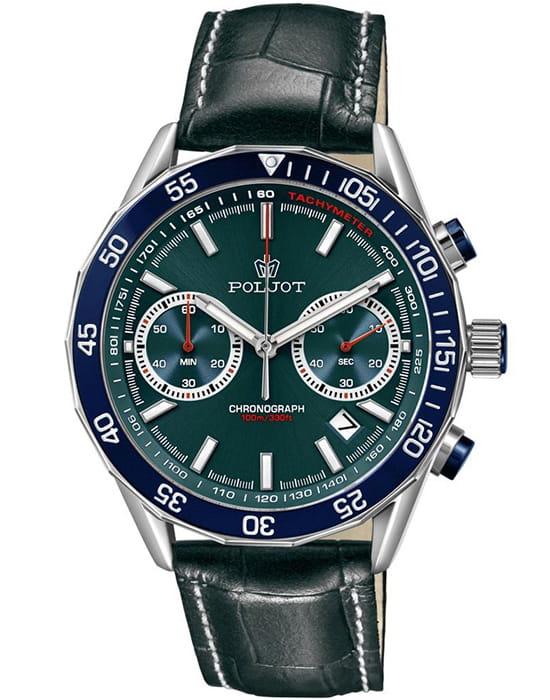 Poljot 6S21.181258 — яркие мужские часы с выразительным спортивным характером и акцентом на функциональность. Корпус из нержавеющей стали придаёт модели надёжность и солидность, а насыщенный циферблат с контрастными счётчиками хронографаХронографФункция позволяет измерять отрезки времени с особой точностью: часы, минуты, секунды. Верным признаком хронографа является наличие на циферблате 3 дополнительных окошек-счётчиков. создаёт динамичный и энергичный облик. БезельБезельВнешний ободок, закрепляющий стекло. В спортивных часах так называется поворотное кольцо с делениями на циферблате, выполняет роль таймера – замеряет отрезки времени на шкале. Неподвижный безель – элемент декора. Однонаправленно вращающийся безель на дайверских часах позволяет фиксировать моменты погружения и выныривания на поверхность. с PVD-покрытиемPVDУльтратонкое покрытие наносится в технике вакуумного напыления, сочетает в себе нитрид титана особой прочности со слоем золота или оксида хрома. Несёт в себе декоративную или защитную функцию.. Широкие стрелки и метки с люминесцентным покрытиемЛюминесцентное покрытиеПозволяет считывать показания времени в темноте. Производители наносят на стрелки, часовые индексы, безель или поверхность циферблата светонакопительный состав, дающий холодное свечение. обеспечивают отличную читаемость в любых условиях, а внешний обод с минутной шкалой подчёркивает спортивный стиль. Окно даты добавляет практичности. Прочное минеральное стеклоМинеральное стеклоМинеральное стекло представляет собой искусственно выращенный минерал кварца. Такое стекло отличается особой устойчивостью к повреждениям и царапинам. Уступает по некоторым качествам сапфировому стеклу. надёжно защищает циферблат от повреждений, а ремешок из натуральной кожи гармонично дополняет контрастную цветовую палитру. Poljot — это смелое сочетание спортивной энергии, точности и современного дизайна для активного и уверенного мужчины.