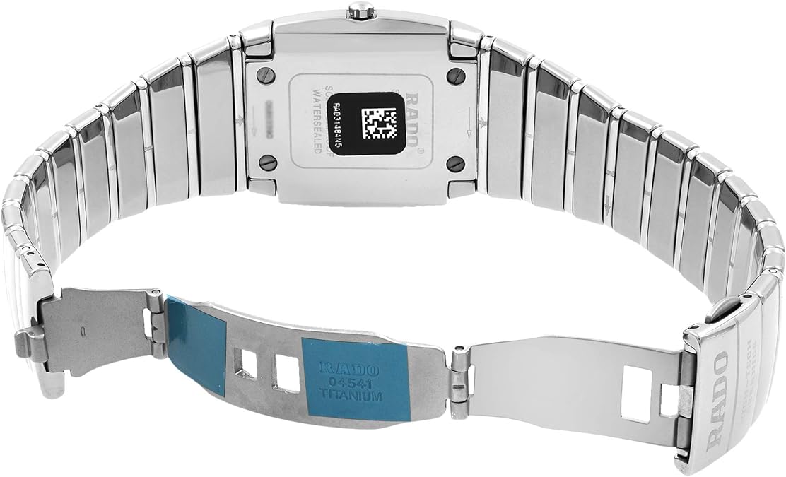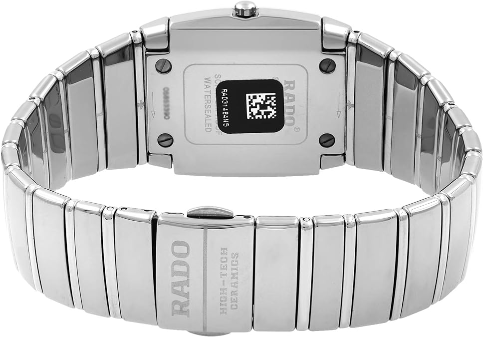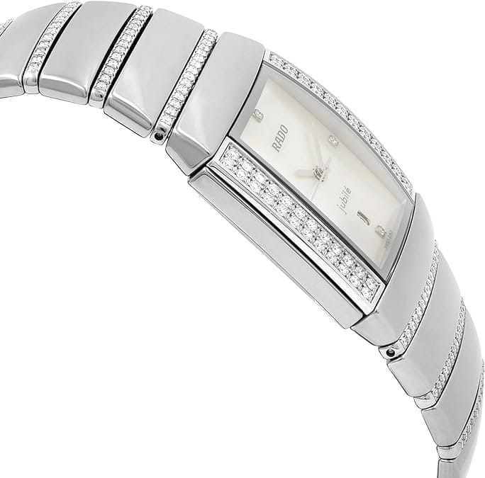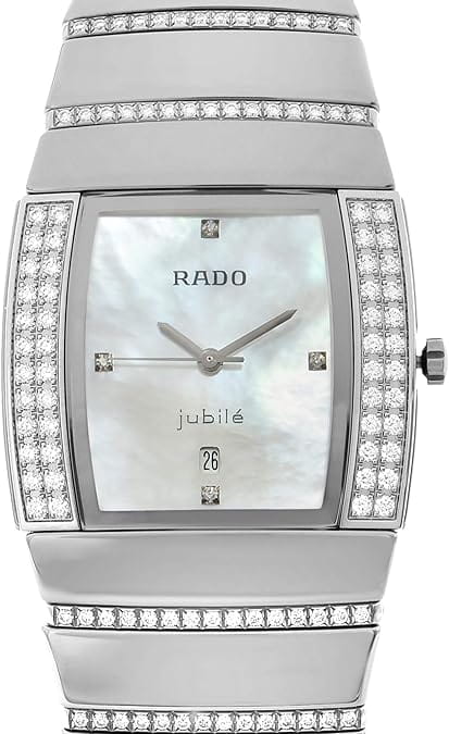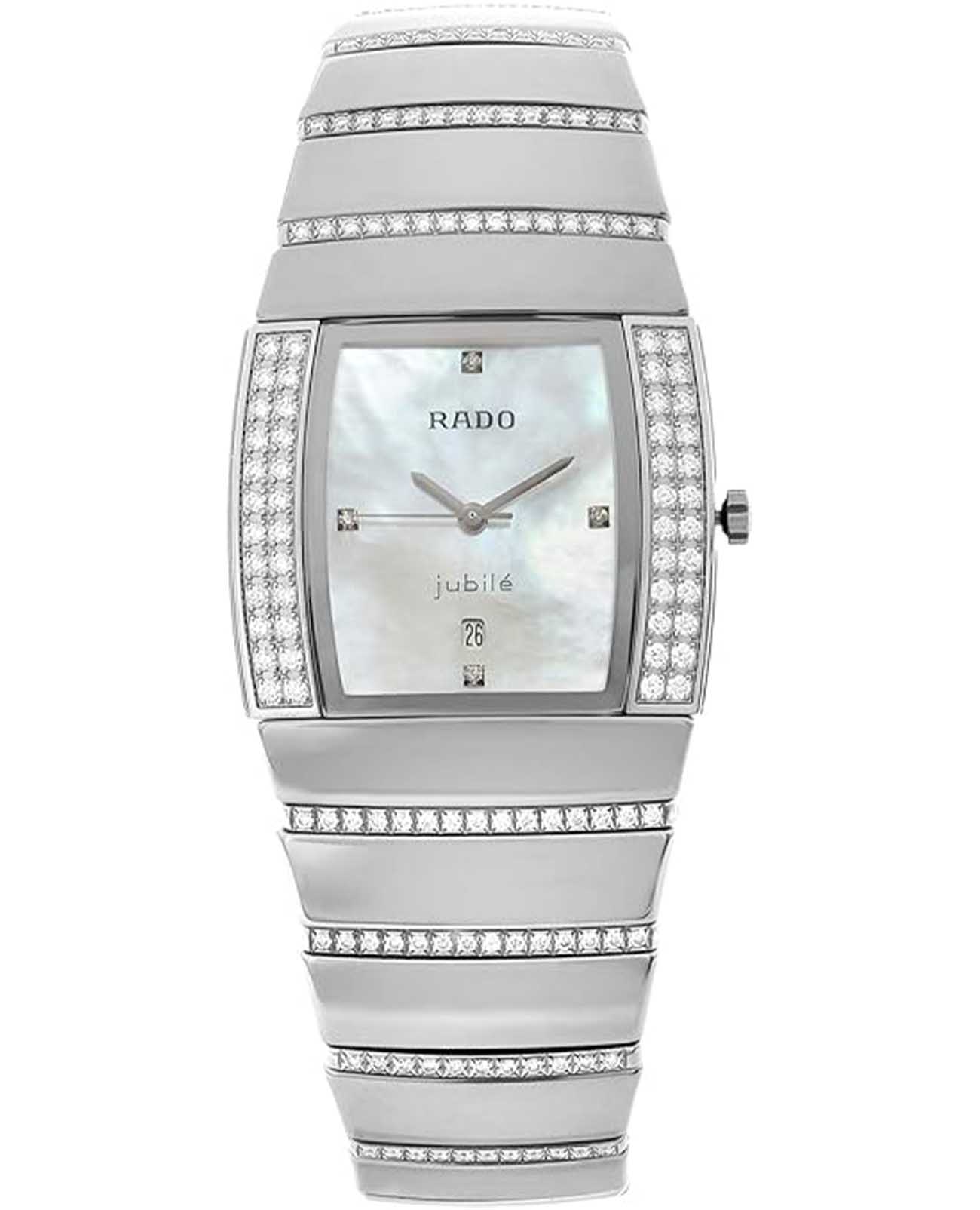 Часы Rado Sintra R13577909, произведение искусства и технологическое чудо, станут прекрасным дополнением к коллекции. Эти швейцарские часы оснащены кварцевым механизмом с указателем даты и тремя стрелками, заключенным в корпус из нержавеющей стали. Браслет изготовлен из высокотехнологичной керамикиВысокотехнологичная керамикаИнновационный запатентованный Rado материал с гладкой или матовой поверхностью. Керамика за счёт кристаллической структуры обладает повышенной устойчивостью от возникновения царапин. Материал способен принимать температуру тела человека, обеспечивая невероятный комфорт при ношении. с раскладной застёжкойРаскладная застёжкаТакой тип застёжки используется только на браслетах из металла. Она никогда не раскрывается полностью, происходит разделение на 2 и более частей. Раскладывающая застёжка снизит вероятность потери часов к минимуму.. Корпус украшен 48 бриллиантами, циферблат 4 бриллианта, браслет 102 бриллианта. Сапфировое стеклоСапфировое стеклоПрочный и надёжный материал из кристалла сапфира синтетического происхождения, характеризующийся особой твёрдостью и устойчивостью к царапинам и повреждениям. устойчивое к появлению царапин, обладающее высокой прозрачностью. Класс водозащиты: 30 метров, позволит защитить корпус от случайных брызг или капель дождя.