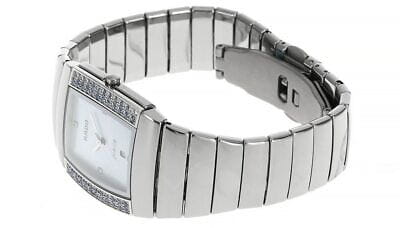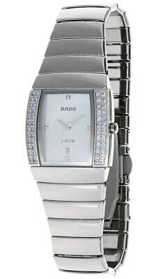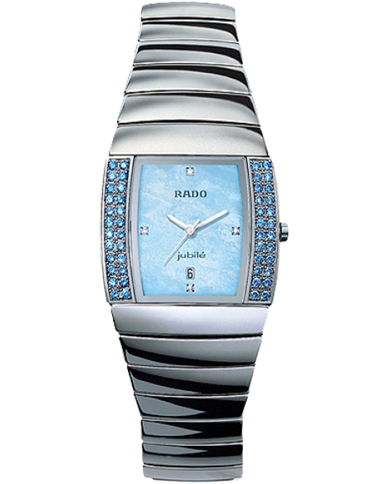 Часы Rado Sintra R13579912, произведение искусства и технологическое чудо, станут прекрасным дополнением к коллекции. Эти швейцарские часы оснащены кварцевым механизмом с указателем даты и тремя стрелками, заключенным в корпус из нержавеющей стали.  Браслет изготовлен из высокотехнологичной керамикиВысокотехнологичная керамикаИнновационный запатентованный Rado материал с гладкой или матовой поверхностью. Керамика за счёт кристаллической структуры обладает повышенной устойчивостью от возникновения царапин. Материал способен принимать температуру тела человека, обеспечивая невероятный комфорт при ношении. с раскладной застёжкойРаскладная застёжкаТакой тип застёжки используется только на браслетах из металла. Она никогда не раскрывается полностью, происходит разделение на 2 и более частей. Раскладывающая застёжка снизит вероятность потери часов к минимуму.. Корпус украшен 48 бриллиантами (0,50 карата). Сапфировое стеклоСапфировое стеклоПрочный и надёжный материал из кристалла сапфира синтетического происхождения, характеризующийся особой твёрдостью и устойчивостью к царапинам и повреждениям. устойчивое к появлению царапин, обладающее высокой прозрачностью. Класс водозащиты: 30 метров, позволит защитить корпус от случайных брызг или капель дождя.