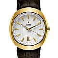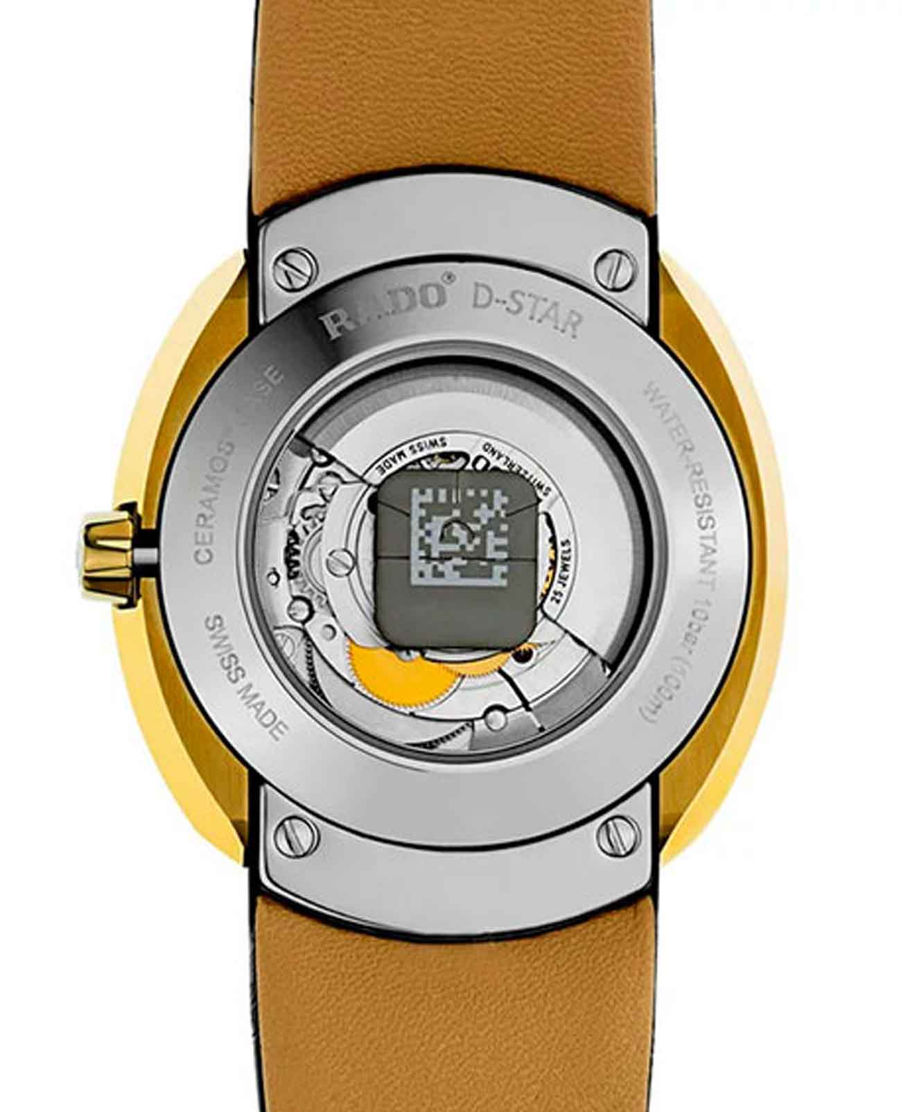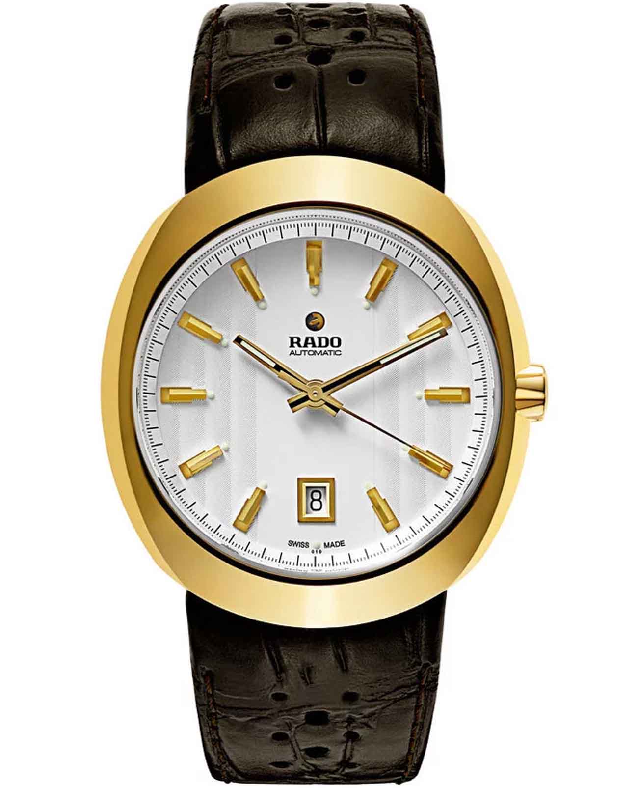 Мужские механические швейцарские часы Rado D-Star R15515105. Сапфировое стеклоСапфировое стеклоПрочный и надёжный материал из кристалла сапфира синтетического происхождения, характеризующийся особой твёрдостью и устойчивостью к царапинам и повреждениям. устойчивое к мелким механическим повреждениям. Корпус часов изготовлен из нержавеющей стали с PVD-покрытиемPVDУльтратонкое покрытие наносится в технике вакуумного напыления, сочетает в себе нитрид титана особой прочности со слоем золота или оксида хрома. Несёт в себе декоративную или защитную функцию.. Стрелки с люминесцентным покрытиемЛюминесцентное покрытиеПозволяет считывать показания времени в темноте. Производители наносят на стрелки, часовые индексы, безель или поверхность циферблата светонакопительный состав, дающий холодное свечение.. Окошко даты находится в положении 6 часов.  Класс водозащиты: 100 метров, позволит плавать, нырять и заниматься другими водными видами спорта. Кожаный ремешок на раскладной застёжкеРаскладная застёжкаТакой тип застёжки используется только на браслетах из металла. Она никогда не раскрывается полностью, происходит разделение на 2 и более частей. Раскладывающая застёжка снизит вероятность потери часов к минимуму..