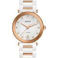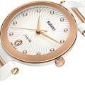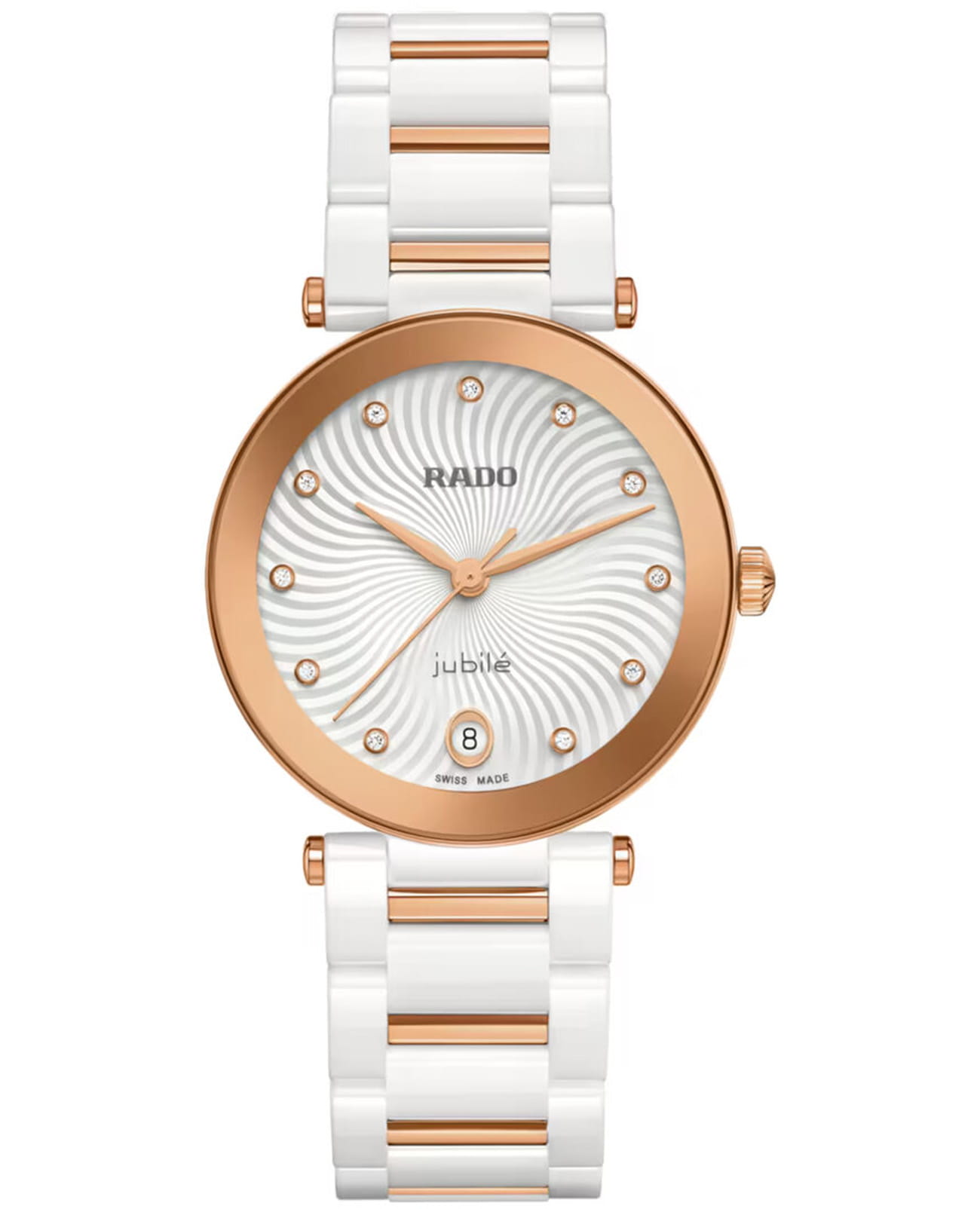 Женские кварцевые часы Rado — это изысканный аксессуар с современным дизайном. Корпус диаметром 31 мм выполнен из высокотехнологичной керамикиВысокотехнологичная керамикаИнновационный запатентованный Rado материал с гладкой или матовой поверхностью. Керамика за счёт кристаллической структуры обладает повышенной устойчивостью от возникновения царапин. Материал способен принимать температуру тела человека, обеспечивая невероятный комфорт при ношении. и нержавеющей стали с PVD-покрытиемPVDУльтратонкое покрытие наносится в технике вакуумного напыления, сочетает в себе нитрид титана особой прочности со слоем золота или оксида хрома. Несёт в себе декоративную или защитную функцию. розового золота. Циферблат белого цвета оформлен аналоговым дисплеем. Циферблат защищён выпуклым сапфировым стекломСапфировое стеклоПрочный и надёжный материал из кристалла сапфира синтетического происхождения, характеризующийся особой твёрдостью и устойчивостью к царапинам и повреждениям.. Окошко даты расположено в положении 3 часов. Механизм — кварцевый. Часы оснащены браслетом из комбинации керамики и стали с PVD-покрытиемPVDУльтратонкое покрытие наносится в технике вакуумного напыления, сочетает в себе нитрид титана особой прочности со слоем золота или оксида хрома. Несёт в себе декоративную или защитную функцию. и застёжкой «бабочка» с кнопкамиЗастёжка "бабочка"Такой вид застёжки дополняется предохранителями, помогающими избежать случайного раскрытия браслета. Обладают изящным исполнением. . Водонепроницаемость 50 м позволяет использовать часы в повседневных условиях. Гарантия — 5 лет на механизм, 2 года на изделие. Идеальный выбор для тех, кто ценит стиль, качество и универсальность.