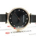 Брендовый аксессуар в стиле fashion отличается эксклюзивным оформлением, над которым работал знаменитый европейский дизайнер Вольфганг Джонсон. Чёрный циферблат с золотистыми стрелками и метками имеет оригинальный узор посередине, по окружности он украшен сияющими цирконами. Привлекательно смотрится браслет плетения Mesh. Кварцевый механизм с высокой точностью хода. Минеральное стекло противостоит образованию царапин. Цветное PVD-покрытиеPVDУльтратонкое покрытие наносится в технике вакуумного напыления, сочетает в себе нитрид титана особой прочности со слоем золота или оксида хрома. Несёт в себе декоративную или защитную функцию. нержавеющей стали. Водонепроницаемость 30 метров. Диаметр корпуса: 34 мм.