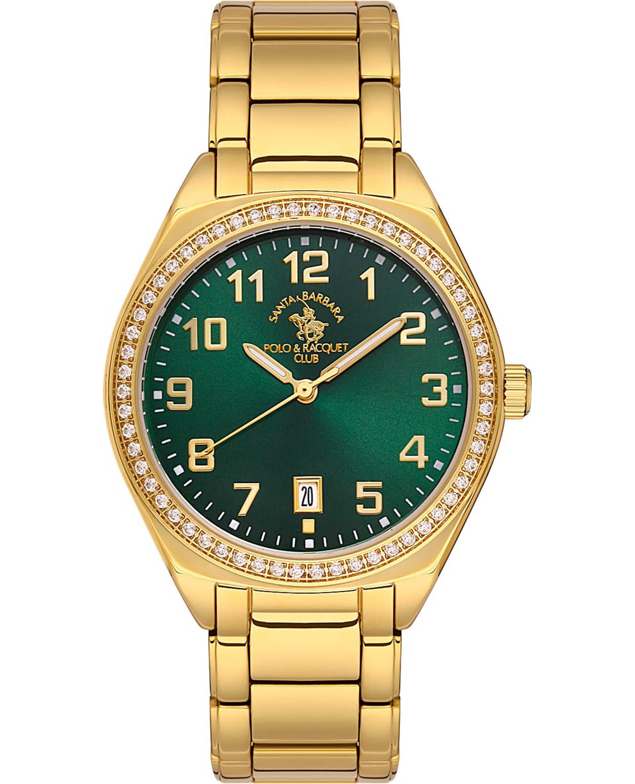 Женские кварцевые часы Santa Barbara Polo & Racquet Club — это стильный и практичный аксессуар. Корпус диаметром 36 мм и высотой 42,5 мм выполнен из латуни с IP-покрытиемIP-покрытиеМетод ионного напыления. Демонстрирует повышенную устойчивость к истиранию, окислению и химическим веществам. Под воздействием высокого давления и температуры около 1500°C молекулы металла надёжно соединяются с частицами корпуса часов.. БезельБезельВнешний ободок, закрепляющий стекло. В спортивных часах так называется поворотное кольцо с делениями на циферблате, выполняет роль таймера – замеряет отрезки времени на шкале. Неподвижный безель – элемент декора. Однонаправленно вращающийся безель на дайверских часах позволяет фиксировать моменты погружения и выныривания на поверхность. украшен кристаллами, придающими изделию изысканный блеск. Циферблат зелёного цвета оформлен по технологии Sunray («солнечные лучи»), дополнен накладными метками в виде штрихов и фирменным логотипом. Окошко даты расположено в положении 6 часов. Стрелки с люминесцентным покрытиемЛюминесцентное покрытиеПозволяет считывать показания времени в темноте. Производители наносят на стрелки, часовые индексы, безель или поверхность циферблата светонакопительный состав, дающий холодное свечение., обеспечивающим хорошую читаемость в темноте. Циферблат защищён минеральным стекломМинеральное стеклоМинеральное стекло представляет собой искусственно выращенный минерал кварца. Такое стекло отличается особой устойчивостью к повреждениям и царапинам. Уступает по некоторым качествам сапфировому стеклу.. Часы оснащены стальным браслетом с IP-покрытиемIP-покрытиеМетод ионного напыления. Демонстрирует повышенную устойчивость к истиранию, окислению и химическим веществам. Под воздействием высокого давления и температуры около 1500°C молекулы металла надёжно соединяются с частицами корпуса часов. и раскладной застёжкойРаскладная застёжкаТакой тип застёжки используется только на браслетах из металла. Она никогда не раскрывается полностью, происходит разделение на 2 и более частей. Раскладывающая застёжка снизит вероятность потери часов к минимуму.. Водонепроницаемость 50 м позволяет использовать часы в повседневных условиях. Идеальный выбор для тех, кто ценит стиль, надёжность и качество.